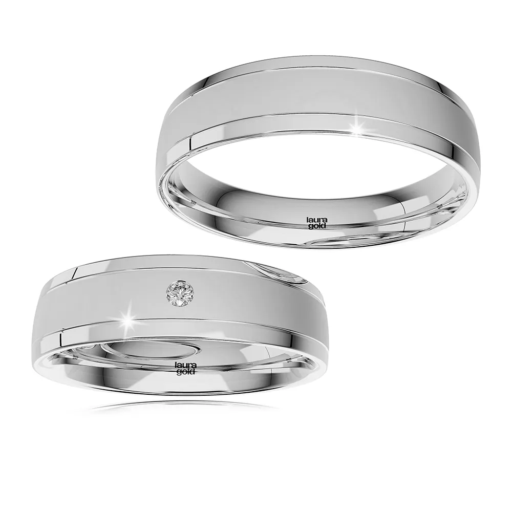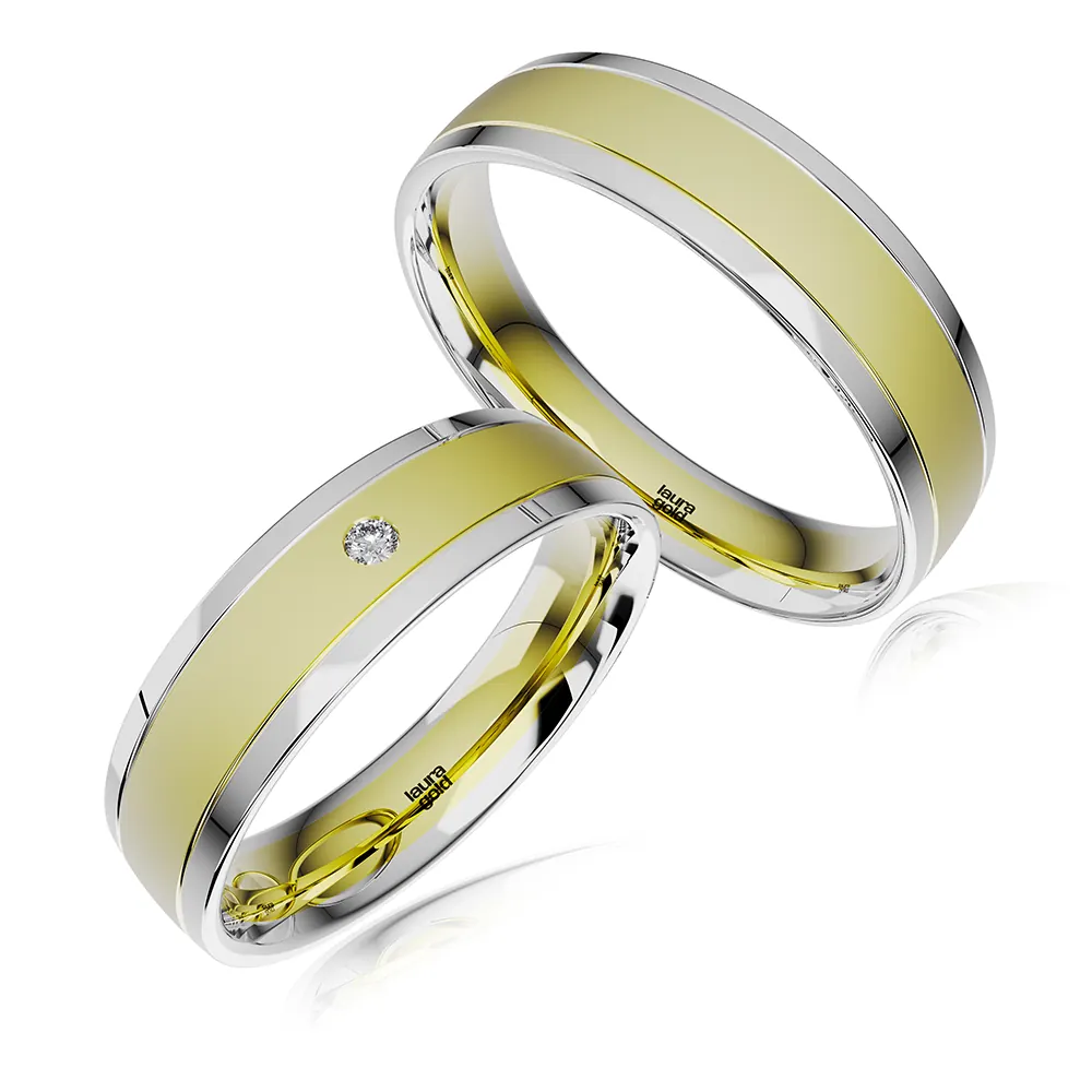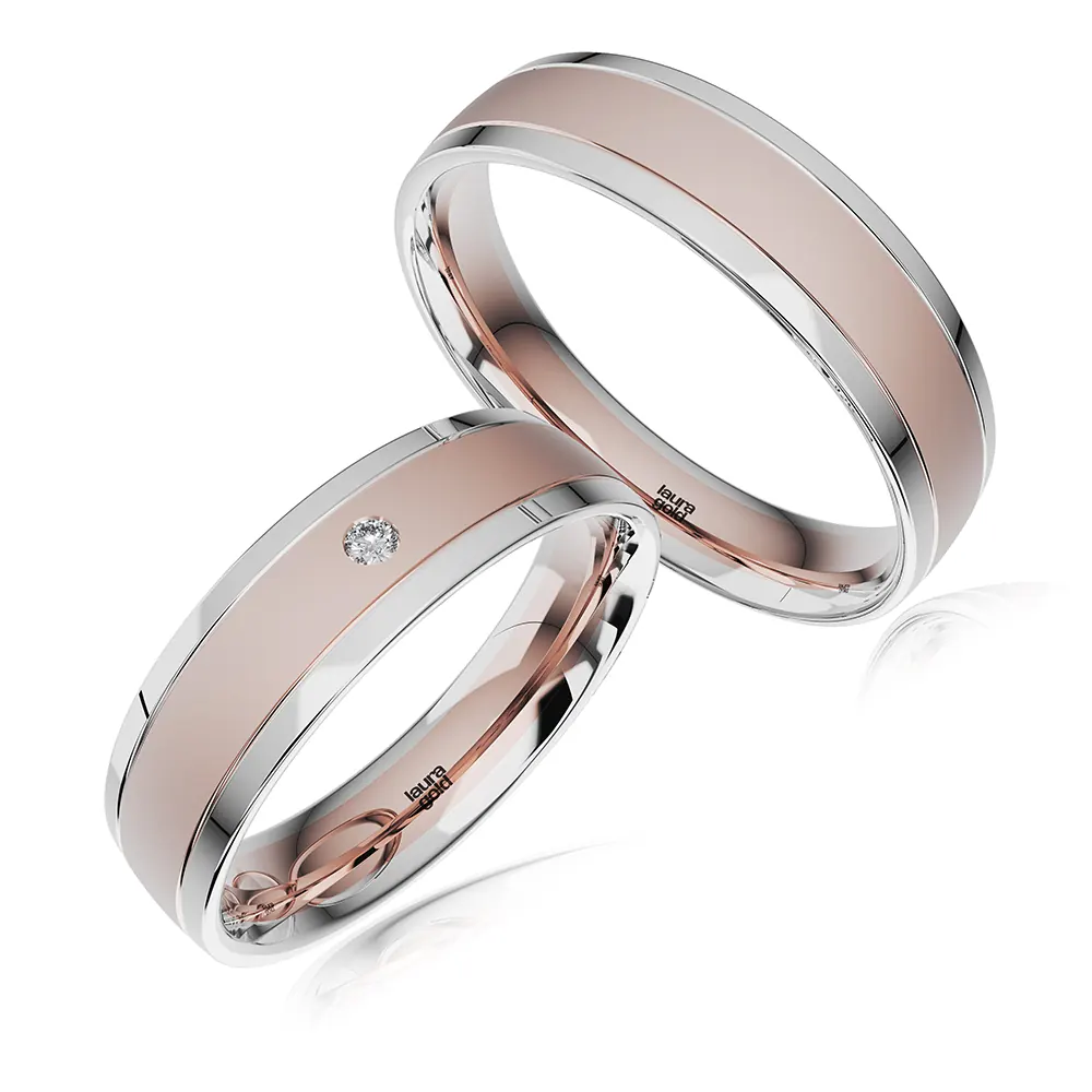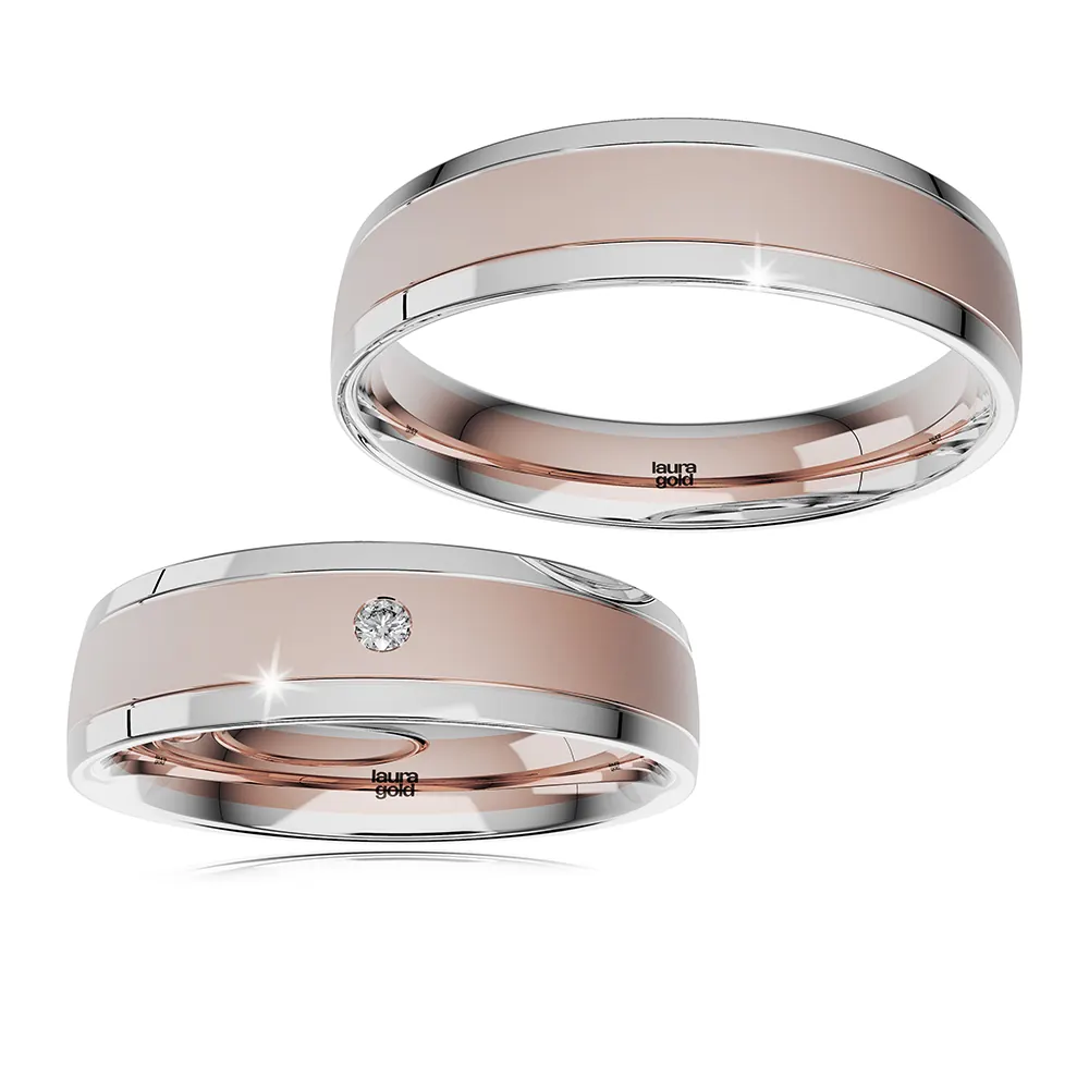 Krásny model z kolekcie Colour. Kombinované obrúčky s dominantným použitím červeného zlata doplnené okrajmi z bieleho zlata. Hladká pánska obrúčka je doplnená dámskou obrúčkou do ktorej sme osadili centrálne jeden kameň zirkónu vo veľkosti 1,5 mm. Obrúčky pre vás vyrobíme aj v inej farebnej kombinácii.
