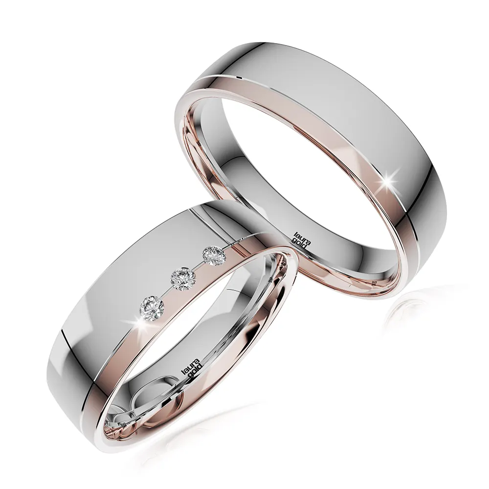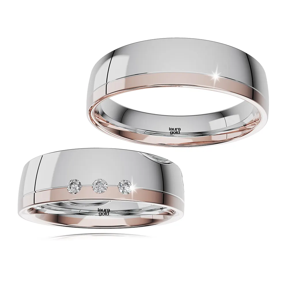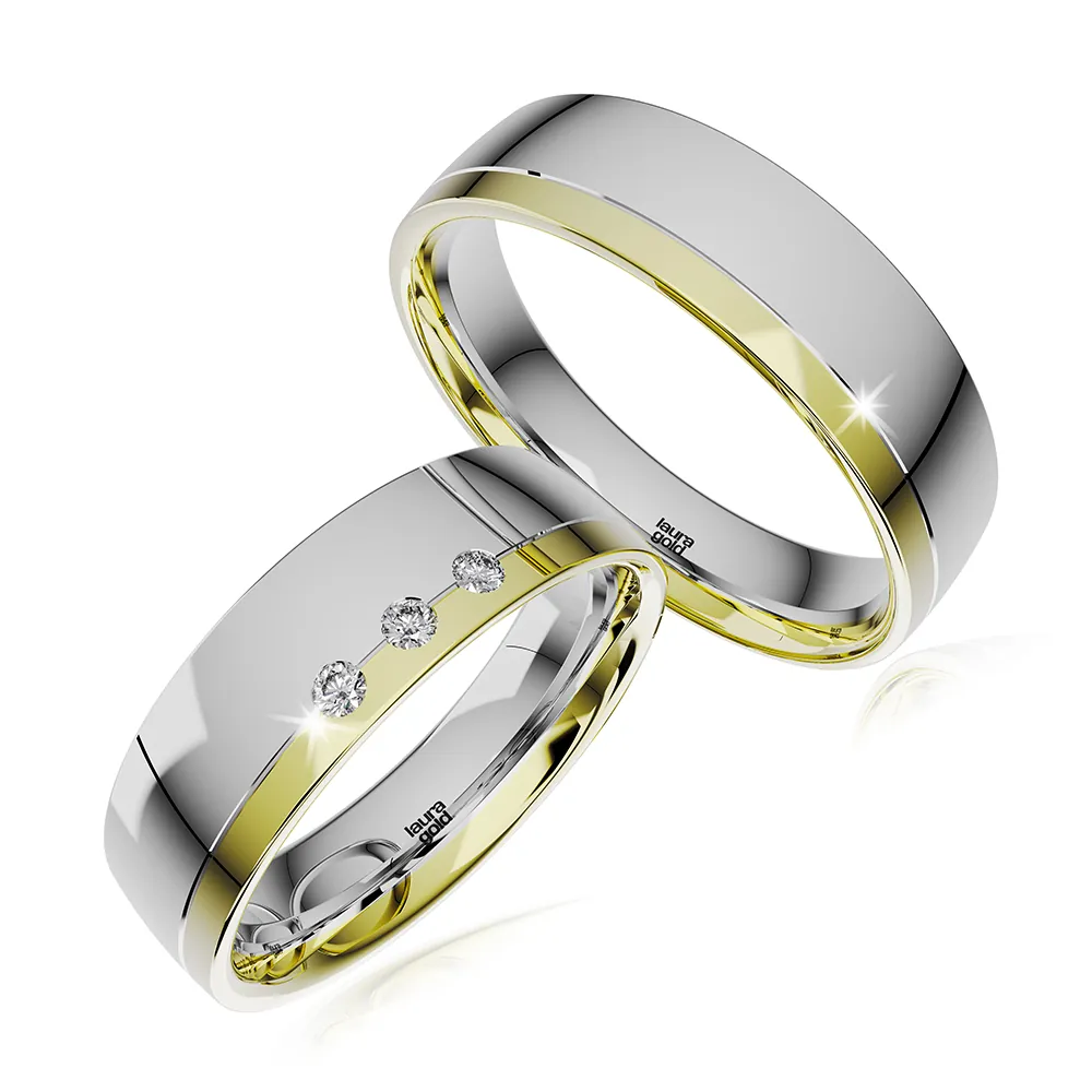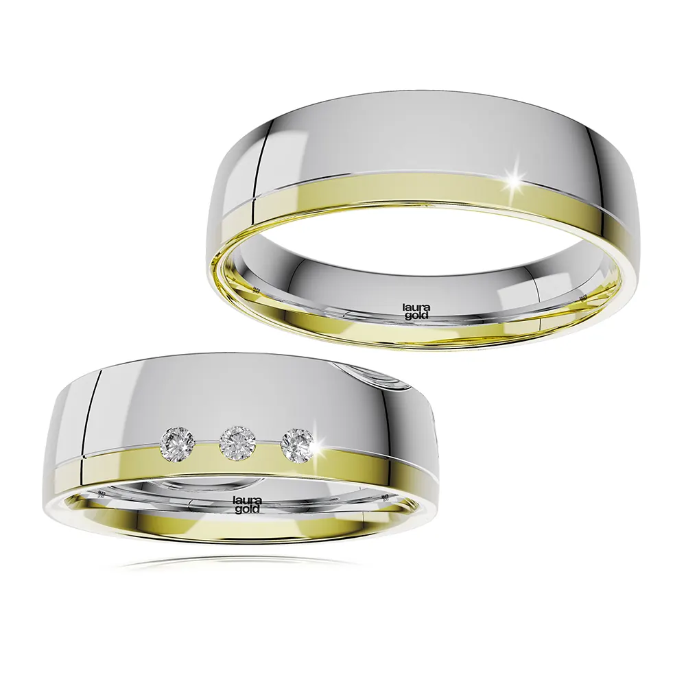 Krásny dvojfarebný model z kolekcie Colour. Dominantná biela farba zlata je doplnená okrajom zo žltého zlata. Pánska obrúčka hladká , pre romantický nádych sme do dámskej obrúčky osadili trblietavé zirkóny, alebo na vaše želanie krásne brúsené diamanty. Tieto prstienky budú na Vás dokonalou ozdobou .