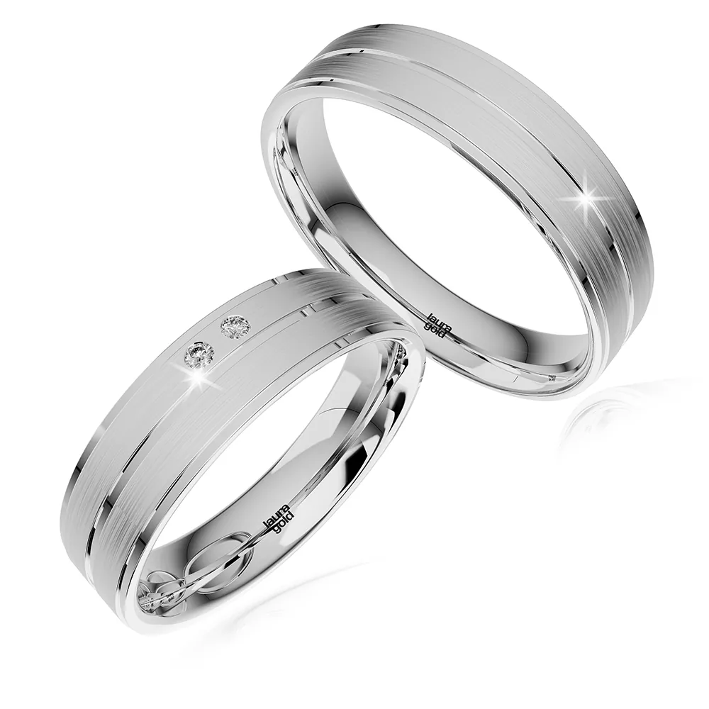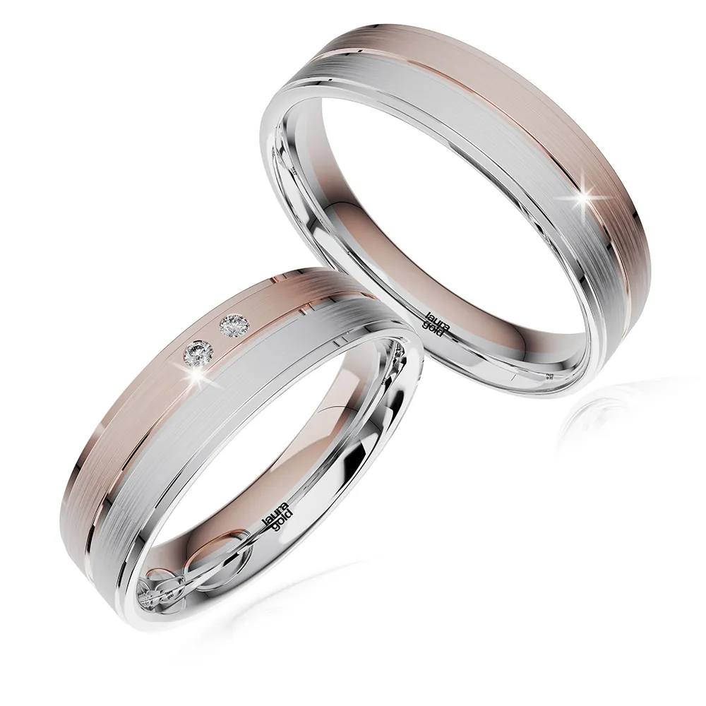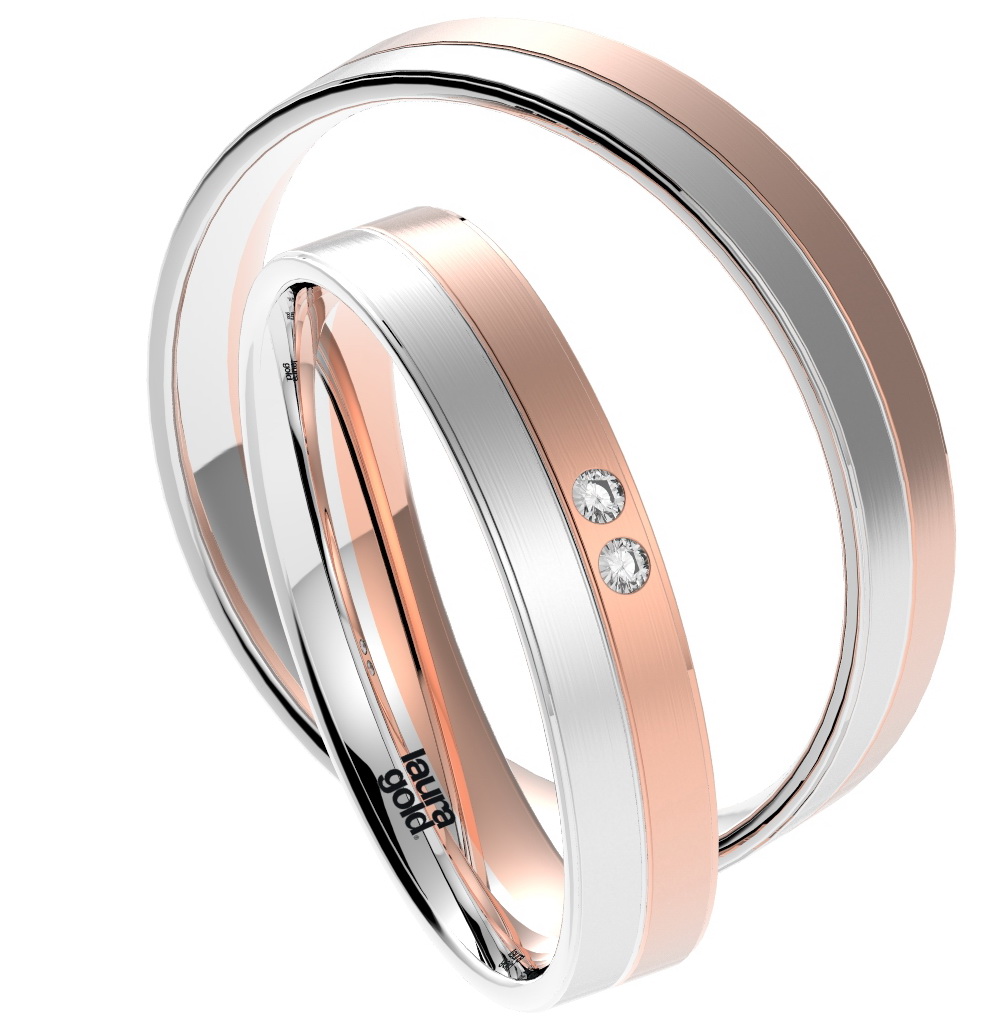 Dvojfarebne riešená kombinácia svadobných obrúčok z kolekcie Colour. Biela farba zlata sa nádherne dopĺňa s ružovou farbou , pričom sú zdobené jemným matom . Do dámskej obrúčky sme osadili sme do ružovej farby osadili 2 kamene zirkónu , alebo na želanie výnimočne brúsené diamanty. Vyberte si kvalitu , vyberte si obrúčky Laura Gold .