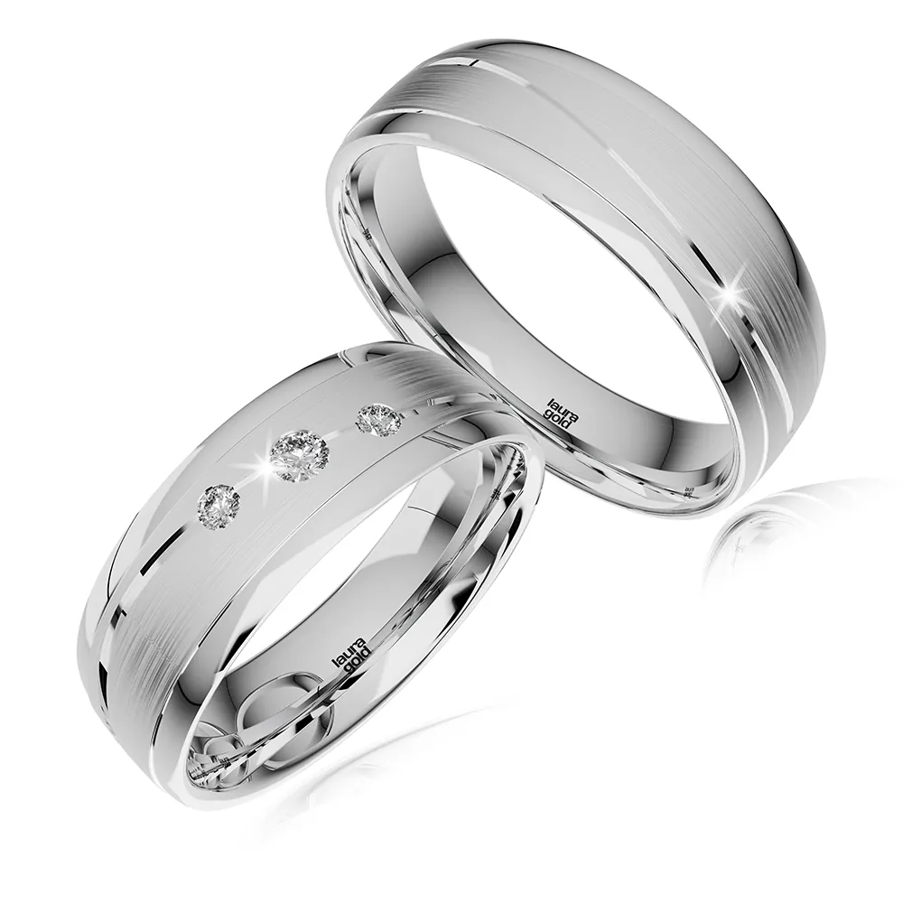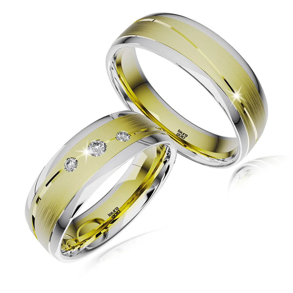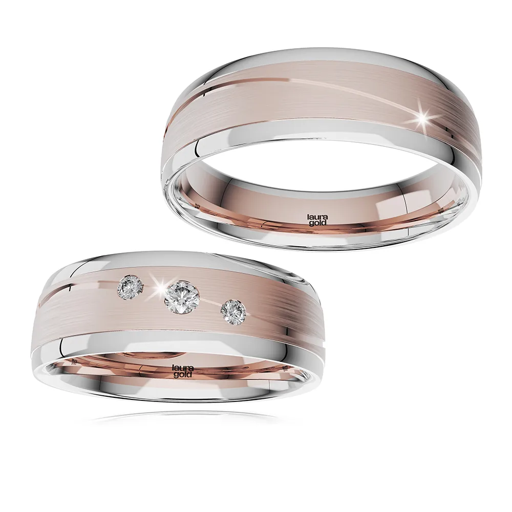 Ďalší model z kolekcie Colour. Krásne kombinované červené zlato s bielym. Okraje obrúčky sú lesklé a stred matovaný s ozdobnou ryhou vinúcou sa stredom obrúčok. Dámska obrúčka má v ryhe osadené dva menšie a stredom jeden väčší kameň. Zvoľte si zirkón , alebo luxusnú verziu s trblietavými briliantami . Farebnú kombináciu si môžete vybrať aj so žltým zlatom.