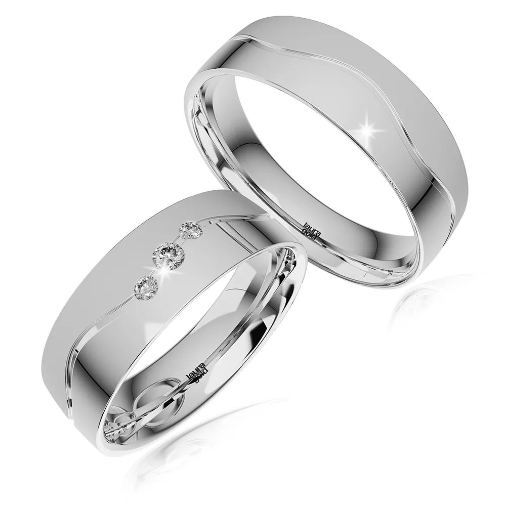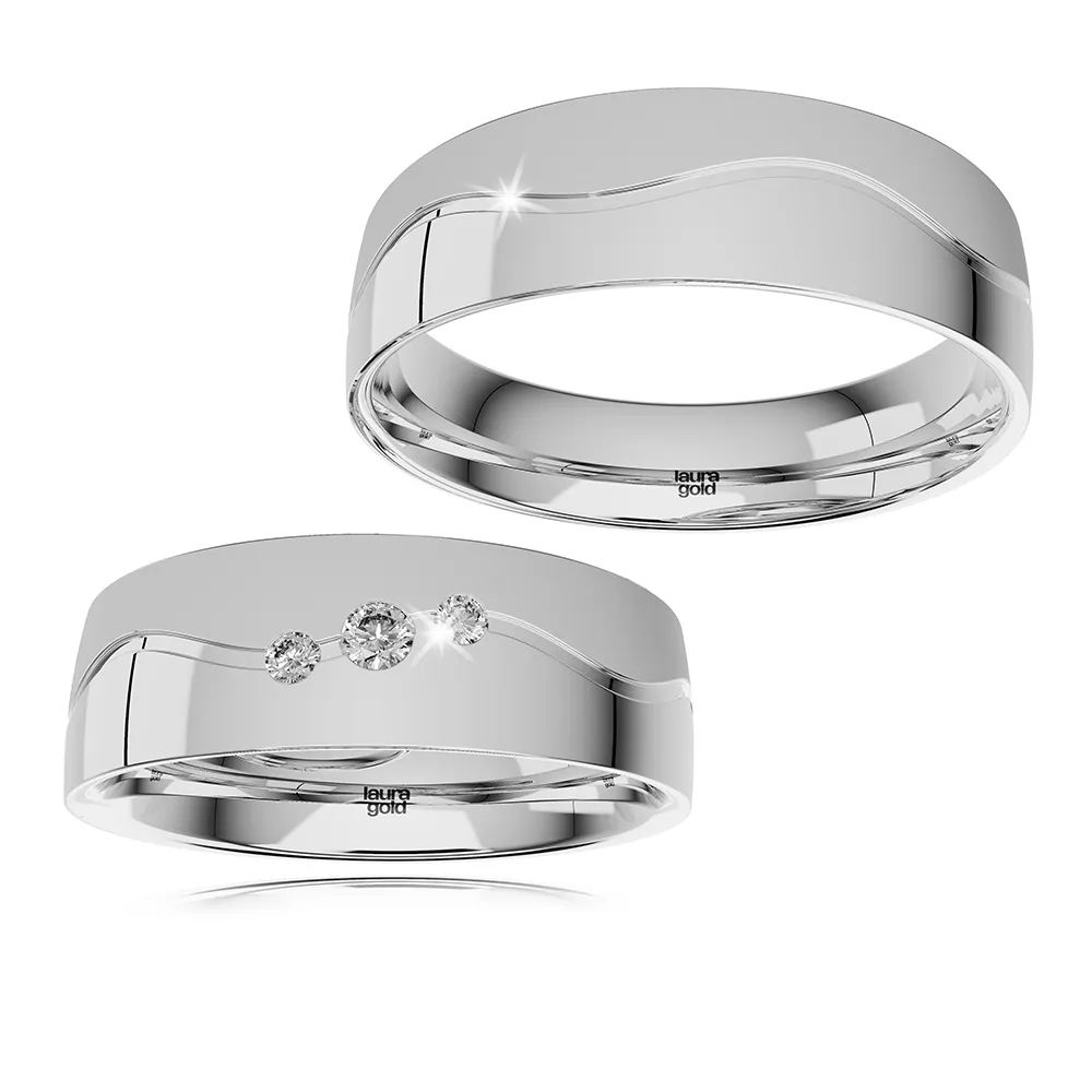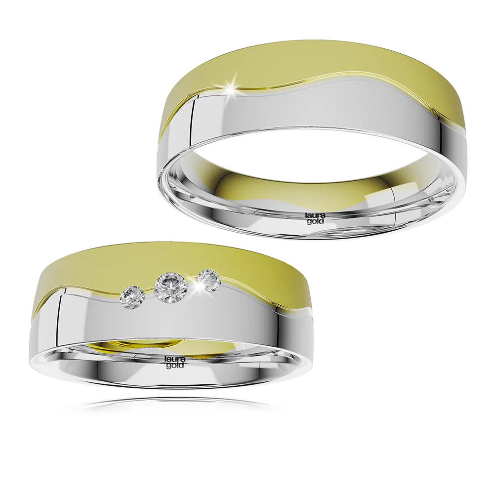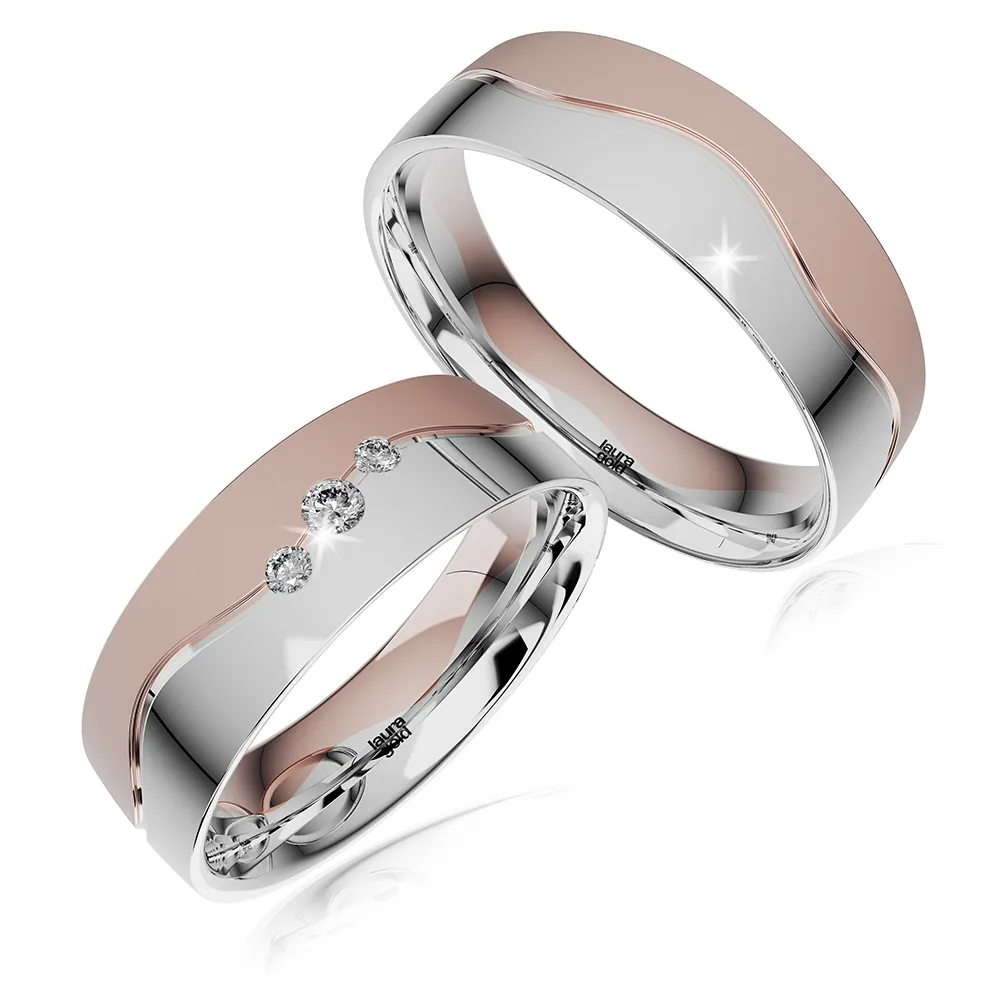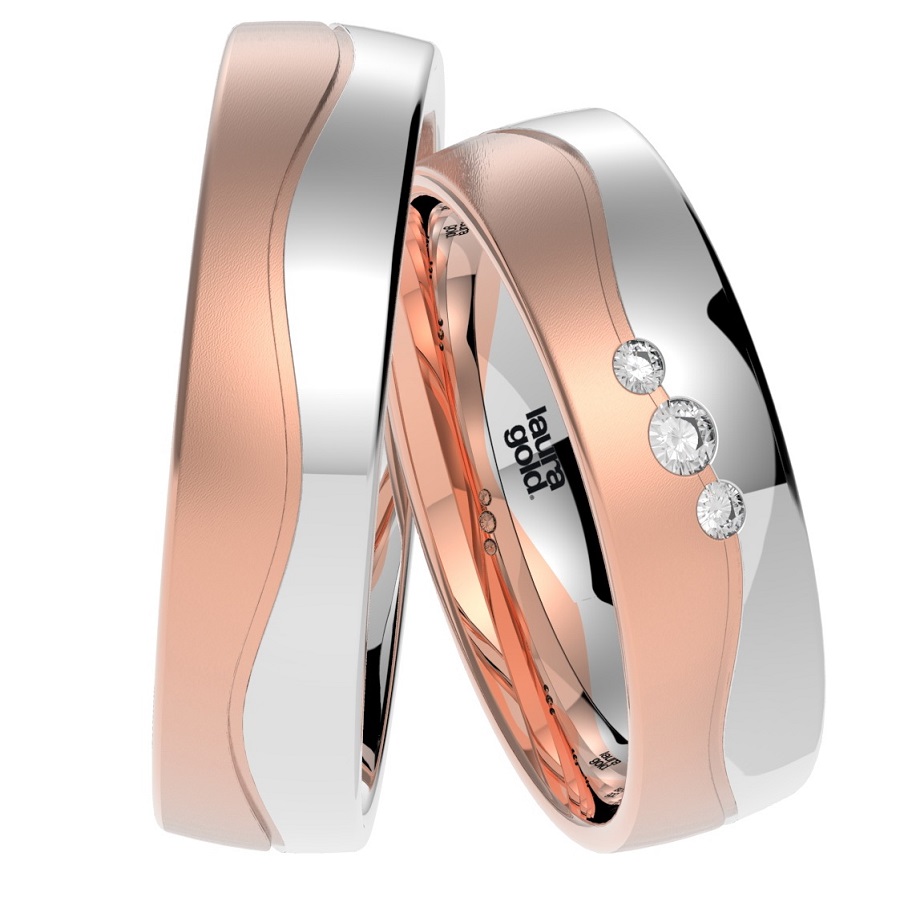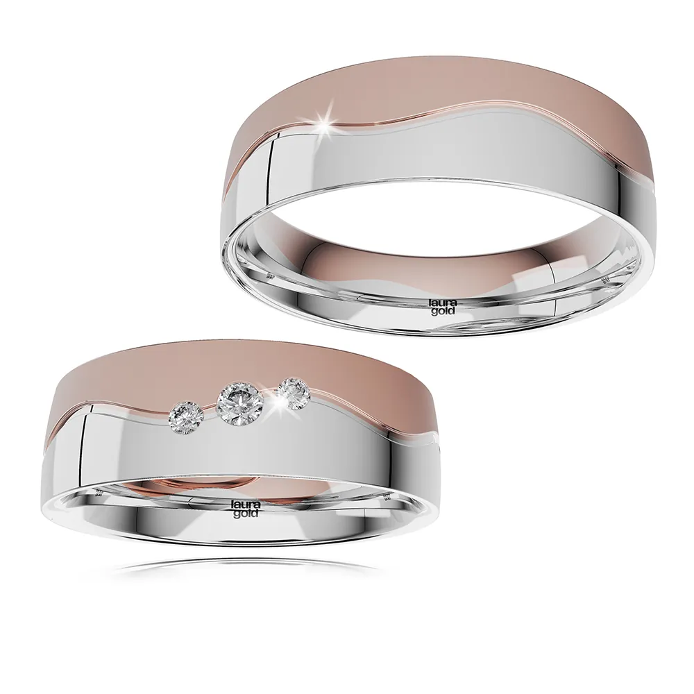 Romantický model z kolekcie Colour. Krásna kombinácia červeného a bieleho zlata, kde stret farieb je tvarovaný do efektnej vlnovky . Biela časť vyleštená do žiarivého lesku a červená časť zmatnená. Do dámskej obrúčky sme do vlnovky osadili 3 trblietavé zirkóny , alebo nádherné brilianty .