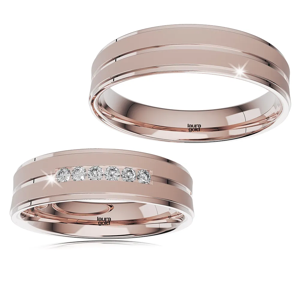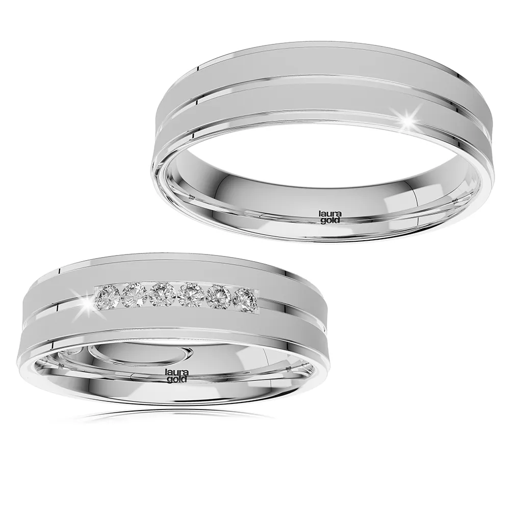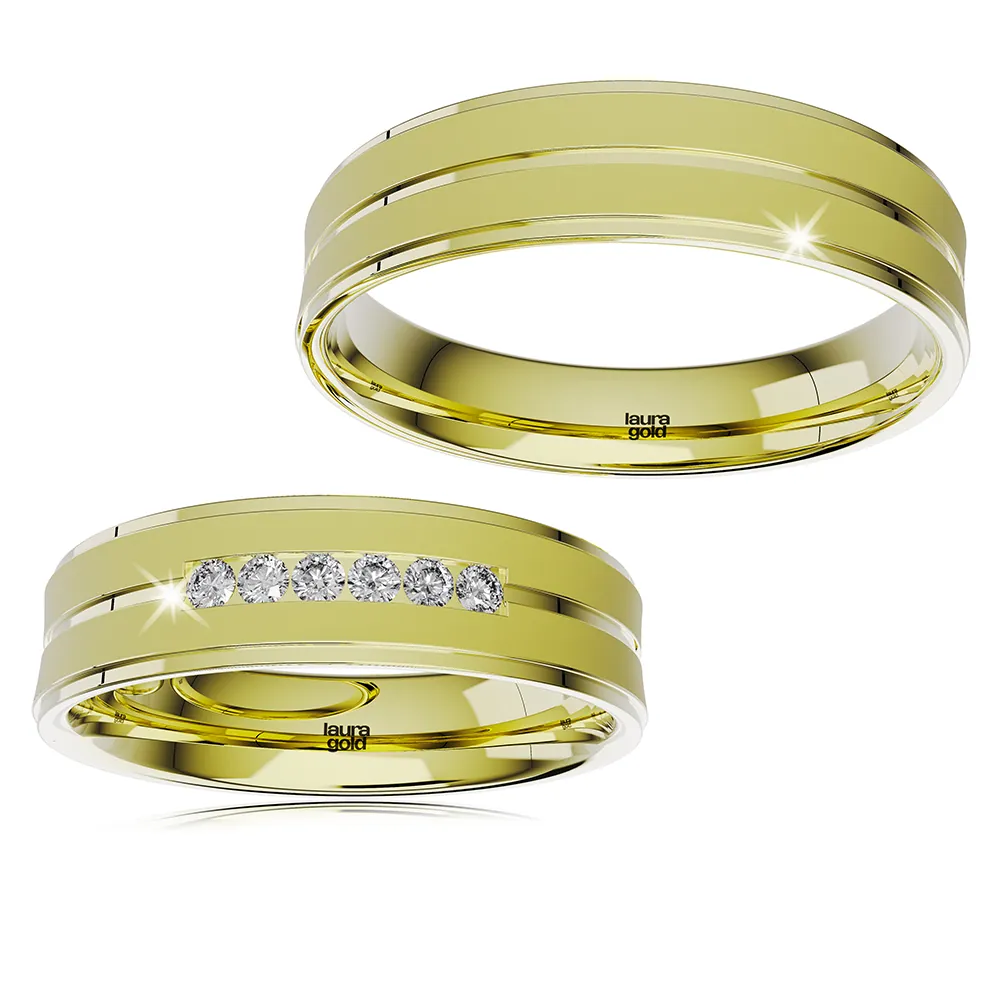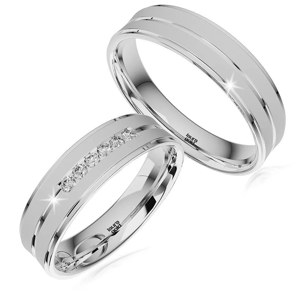 Krásne svadobné obrúčky z kolekcie Elegance . Odlišný, opačný profil ich robí neobvyklými. Zdobí ich povrchová úprava pieskovania a lesklá stredová ryha po celom obvode a taktiež lesklé okraje. Sú krásne svojou jednoduchosťou a atypickosťou. Dámska obrúčka je naviac doplnená o kamene zirkónu alebo luxusných pravých briliantov. Doprajte si najvyšší luxus a kvalitu od Laura Gold.