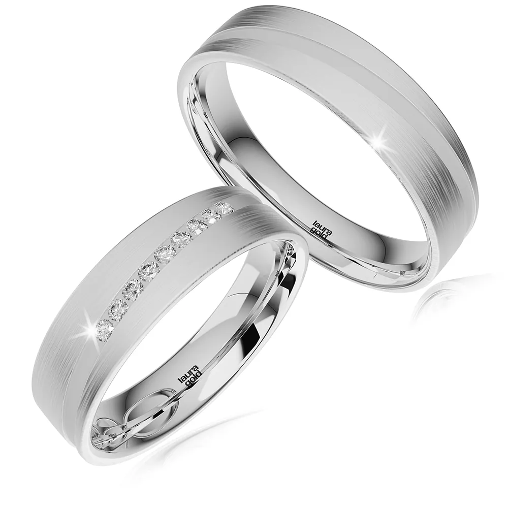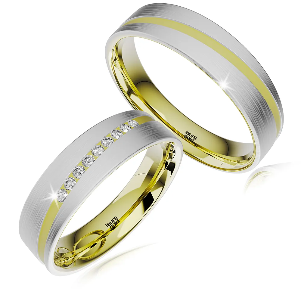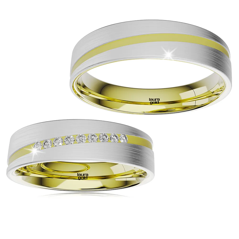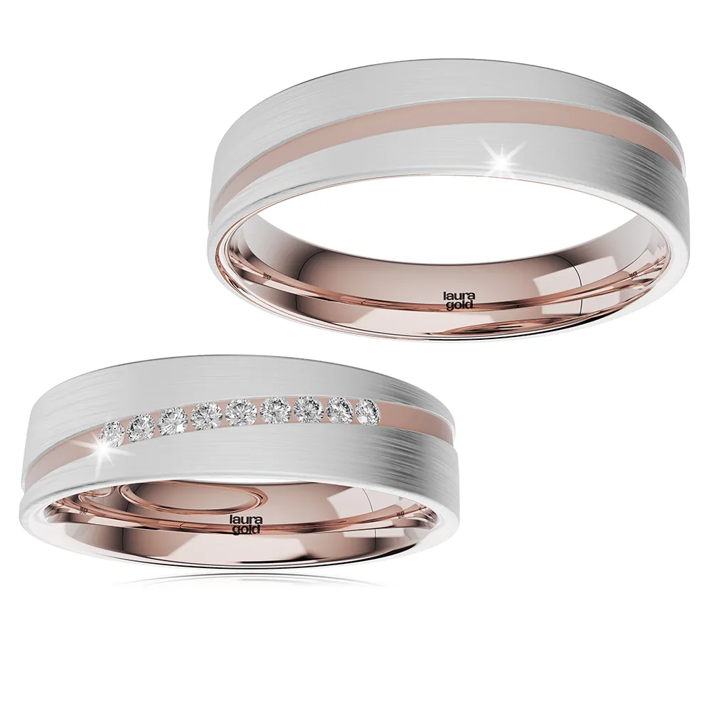 Krásne svadobné obrúčky z kolekcie Elegance . Kombinovaný, dvojvrstvový model sa skladá z bieleho zlata na vonkajšej strane a červeného zlata z vnútornej strany. Po celom obvode sa vinie ryha , ktorá rafinovane odkrýva spodnú farbu zlata . Dámska obrúčka je zdobená trblietavými kameňmi zirkónu osadenými vo vytvorenej ryhe. . Ak túžite po luxuse doprajte si nádherne brúsené diamanty.