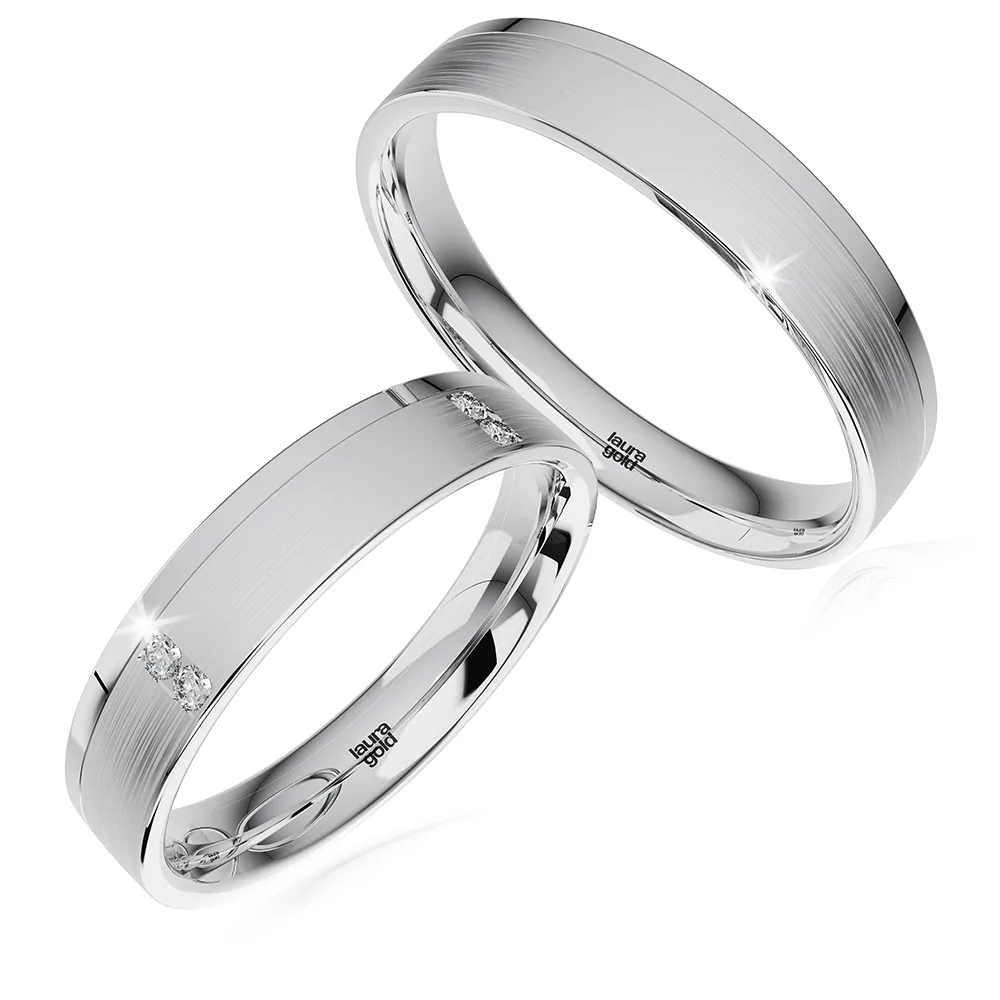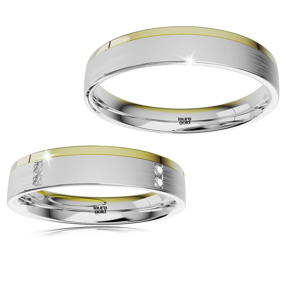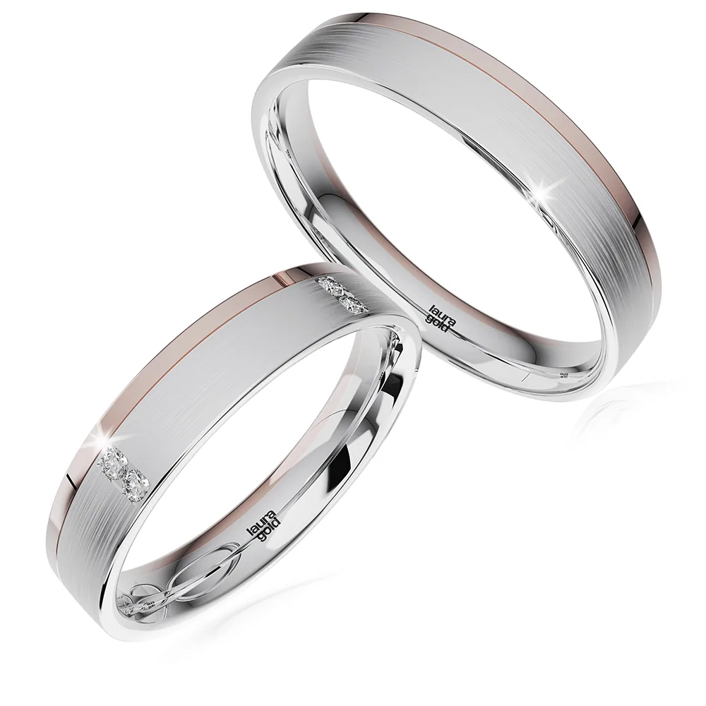 Dvojfarebné svadobné obrúčky z kolekcie Elegance. Dominantná biela farba zlata upravená pozdĺžnym matovaním je príjemne doplnená červeným zlatom na jednom okraji, lešteným do vysokého lesku. Pre dámu sme zvolili osadenie kameňov v pároch po celom obvode obrúčky. Urobte svoj deň dokonalým a vyberte si obrúčky z našej ponuky .