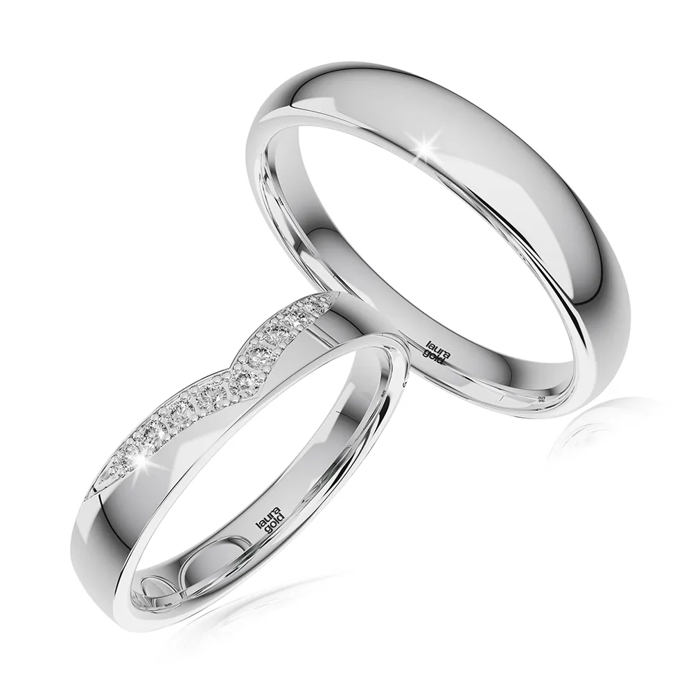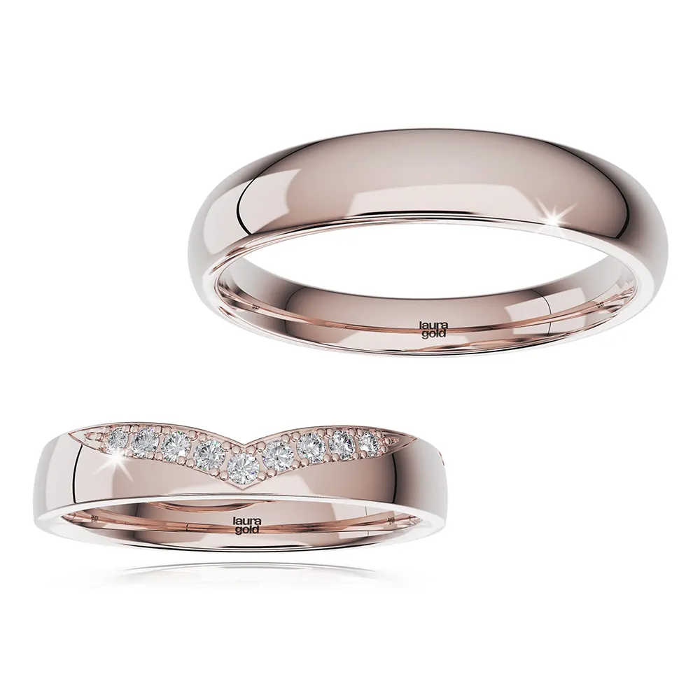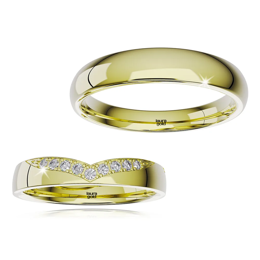 Tieto svadobné obrúčky zo žltého zlata symbolizujú spojenie dvoch sŕdc, ktoré sa rozhodli kráčať spolu životom. Jemný rad žiarivých kamienkov na dámskej obrúčke dodáva iskru lásky, ktorá nikdy nezhasne.