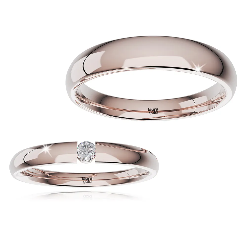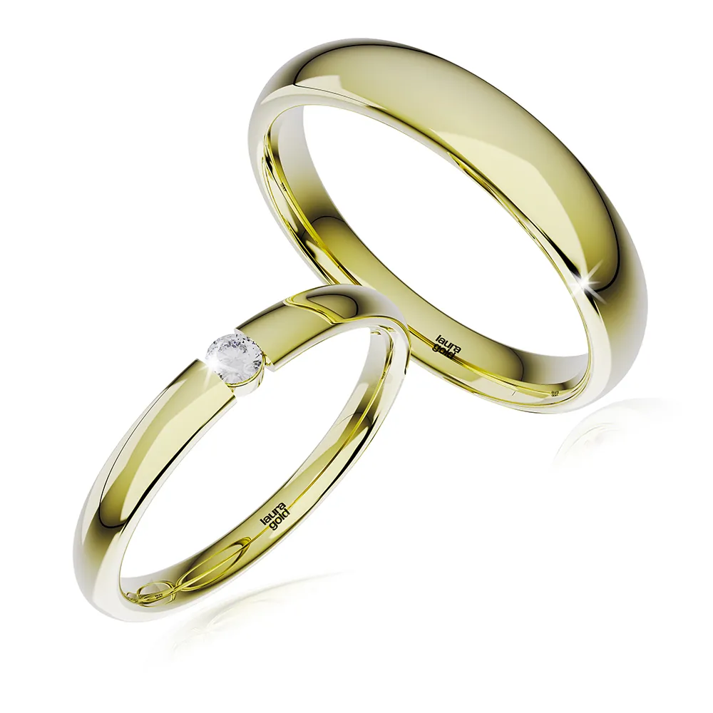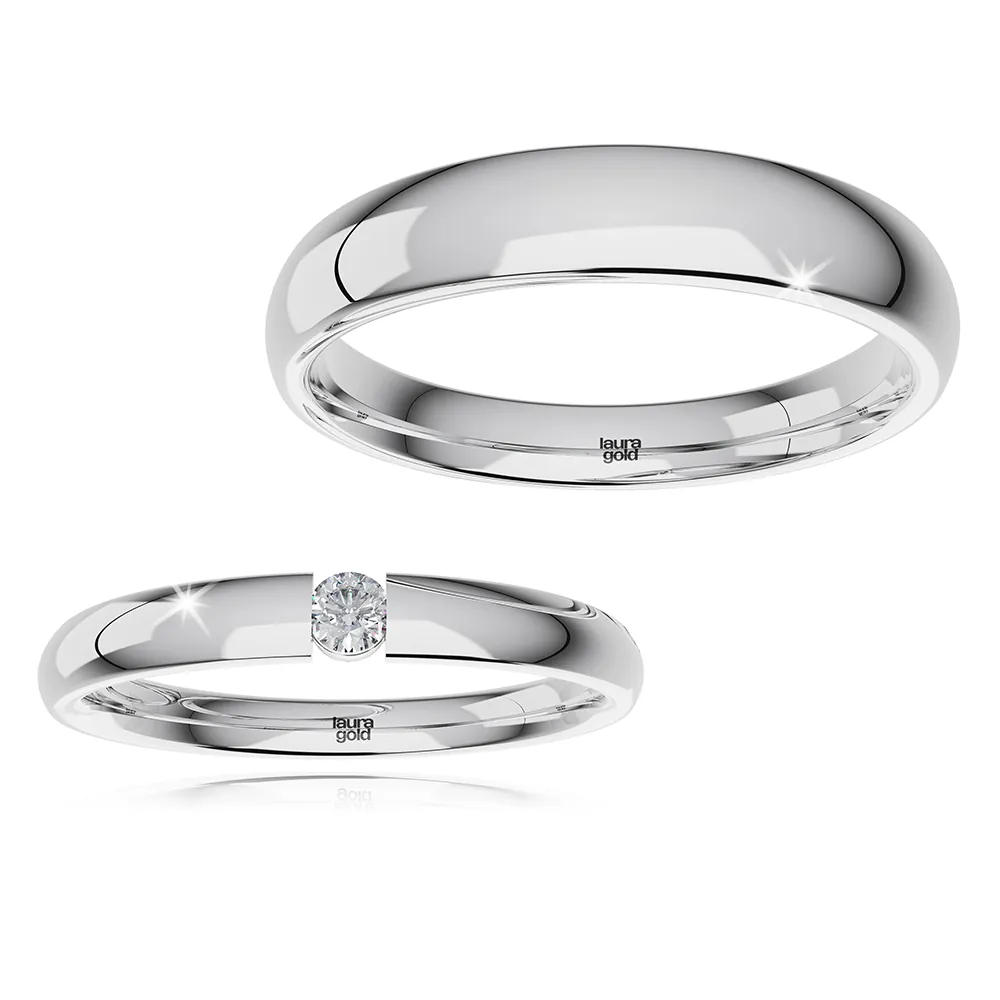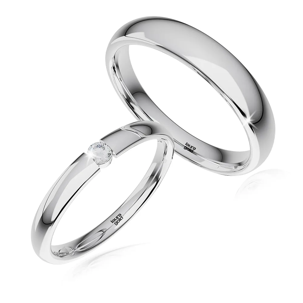 Svadobné obrúčky vyjadrujú večnú lásku a oddanosť. Dámska obrúčka so žiarivým kameňom dodáva súprave jemný lesk, zatiaľ čo pánsky prsteň vyniká svojou nadčasovou eleganciou, spolu tvoriac dokonalú rovnováhu.