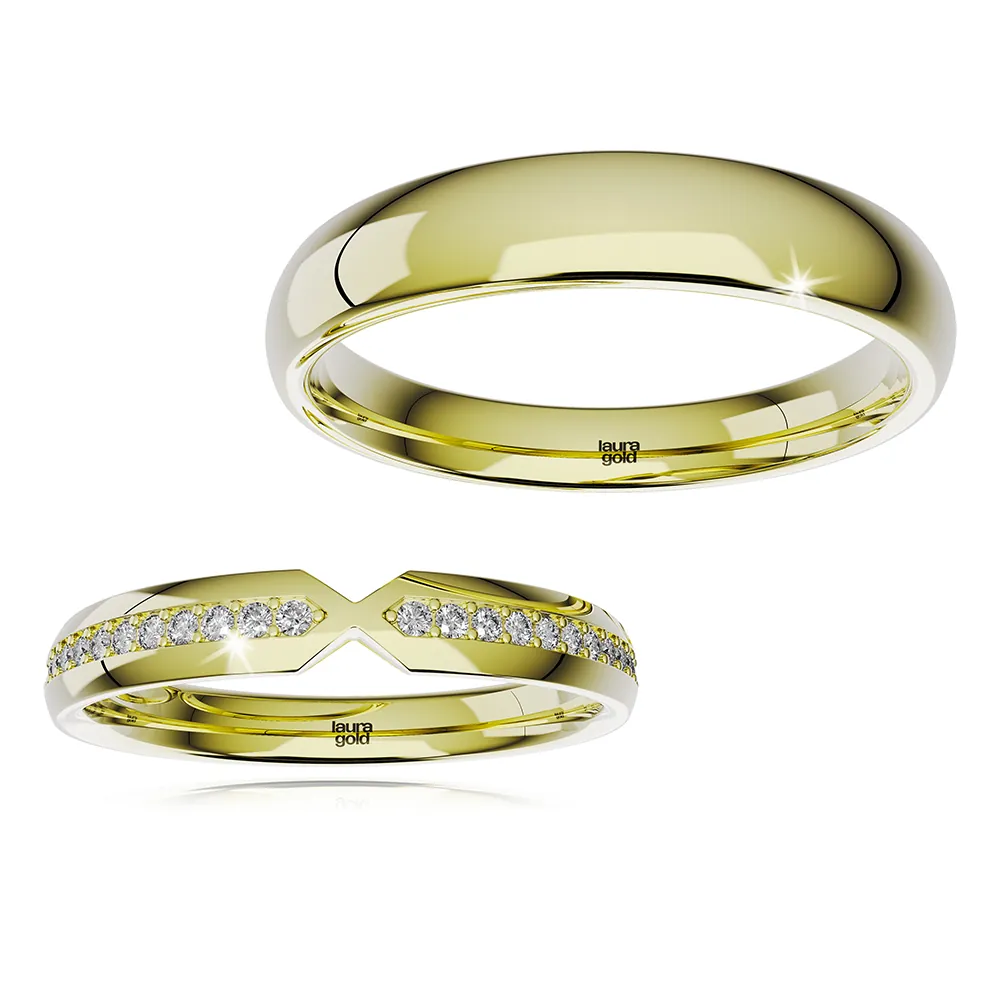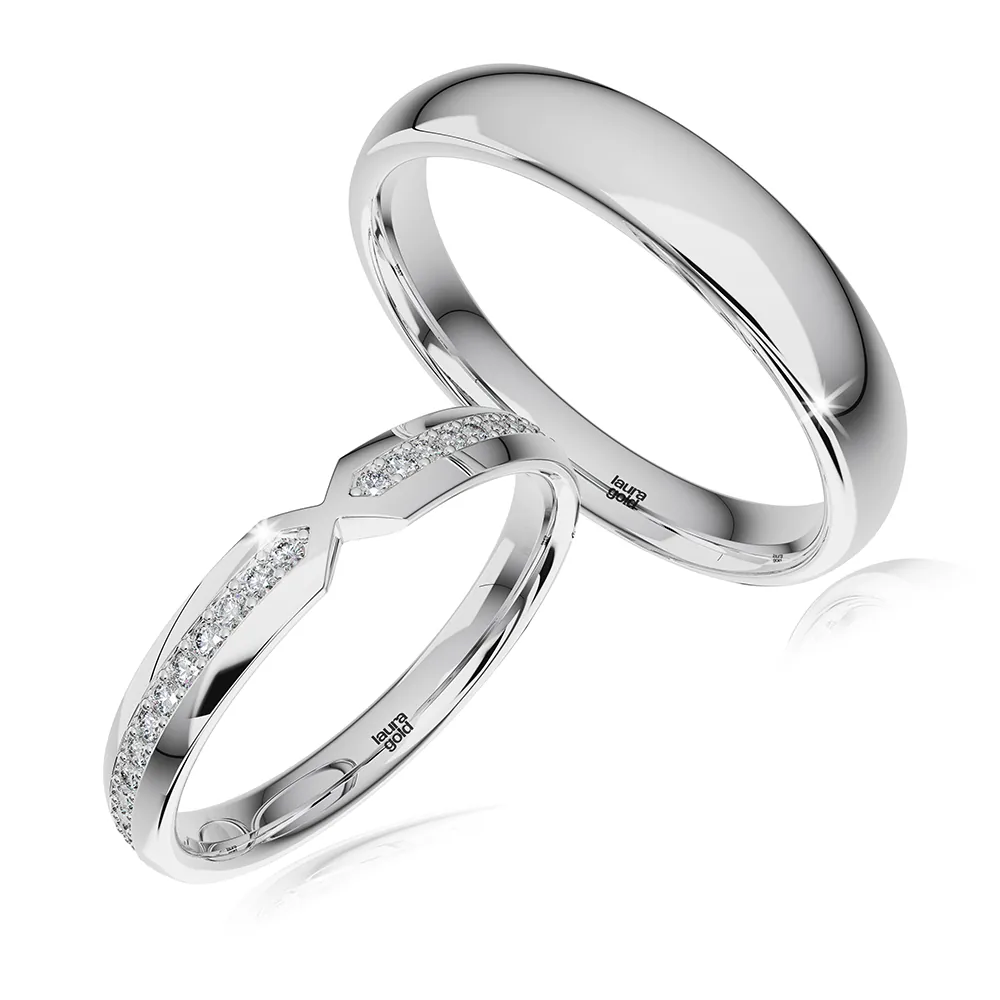 Tieto elegantné obrúčky sú symbolom nadčasovej lásky, kde sa klasická jednoduchosť snúbi s jemnou ženskou eleganciou. Dámska obrúčka je zdobená žiarivými kameňmi, ktoré pripomínajú iskrenie skutočného citu, zatiaľ čo pánska verzia vyžaruje sofistikovanú noblesu. Tento model je možné vyrobiť z bieleho, žltého a ružového 14-karátového zlata, aby dokonale ladil s osobnosťou každého páru.