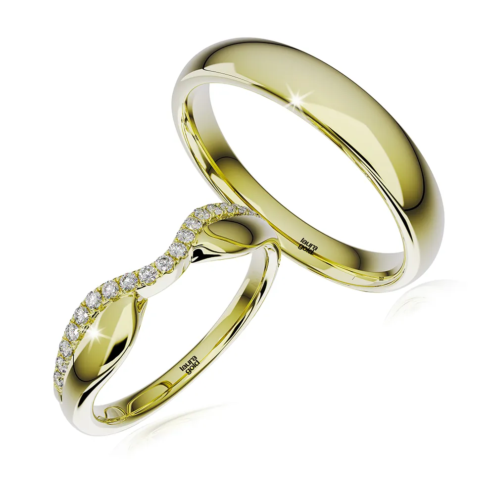 Tieto svadobné obrúčky zo žltého zlata sú stelesnením harmónie, kde sa jednoduchosť snúbi s jemnou eleganciou. Dámska obrúčka zdobená ligotavými kamienkami pripomína iskry lásky, ktoré rozjasňujú spoločnú cestu životom.