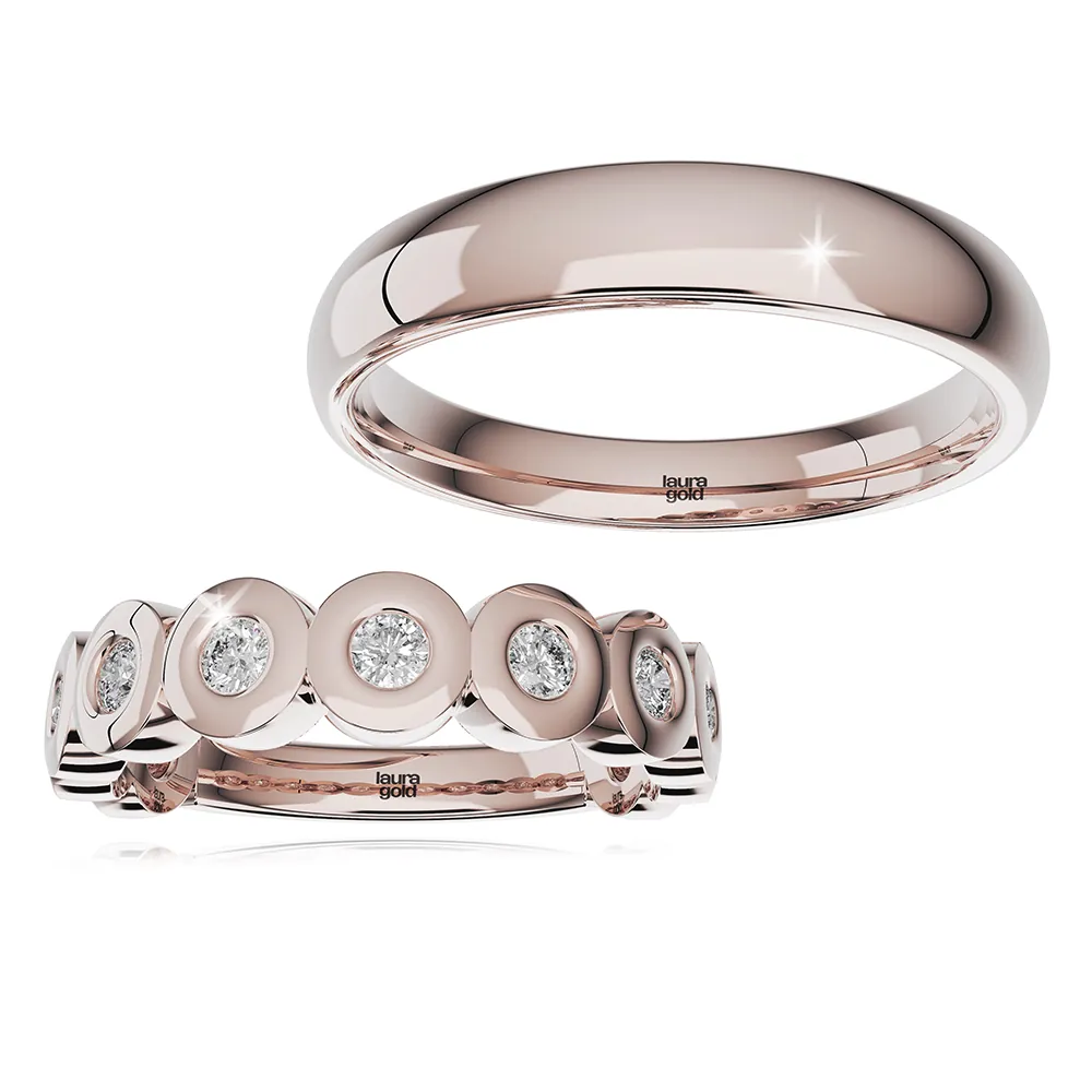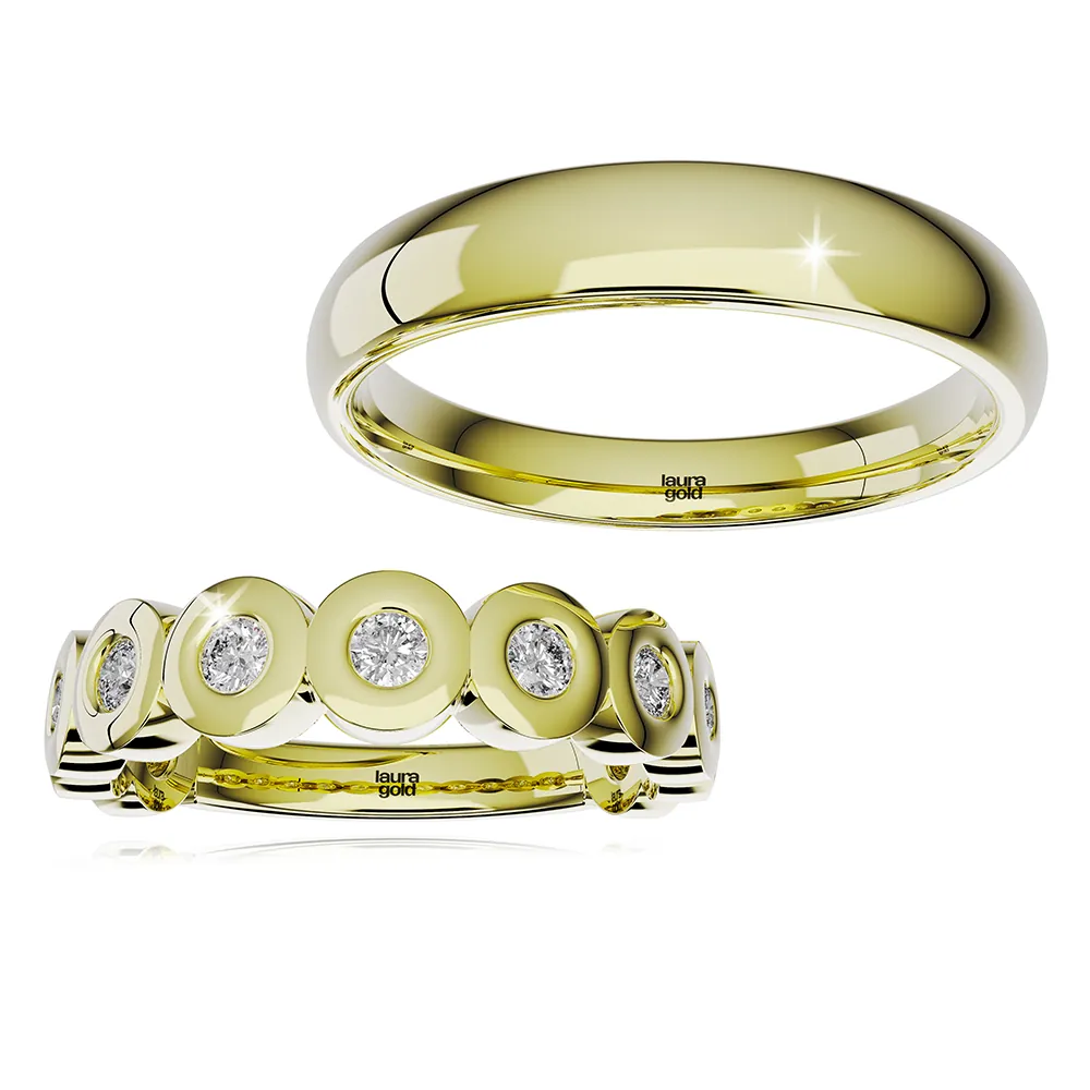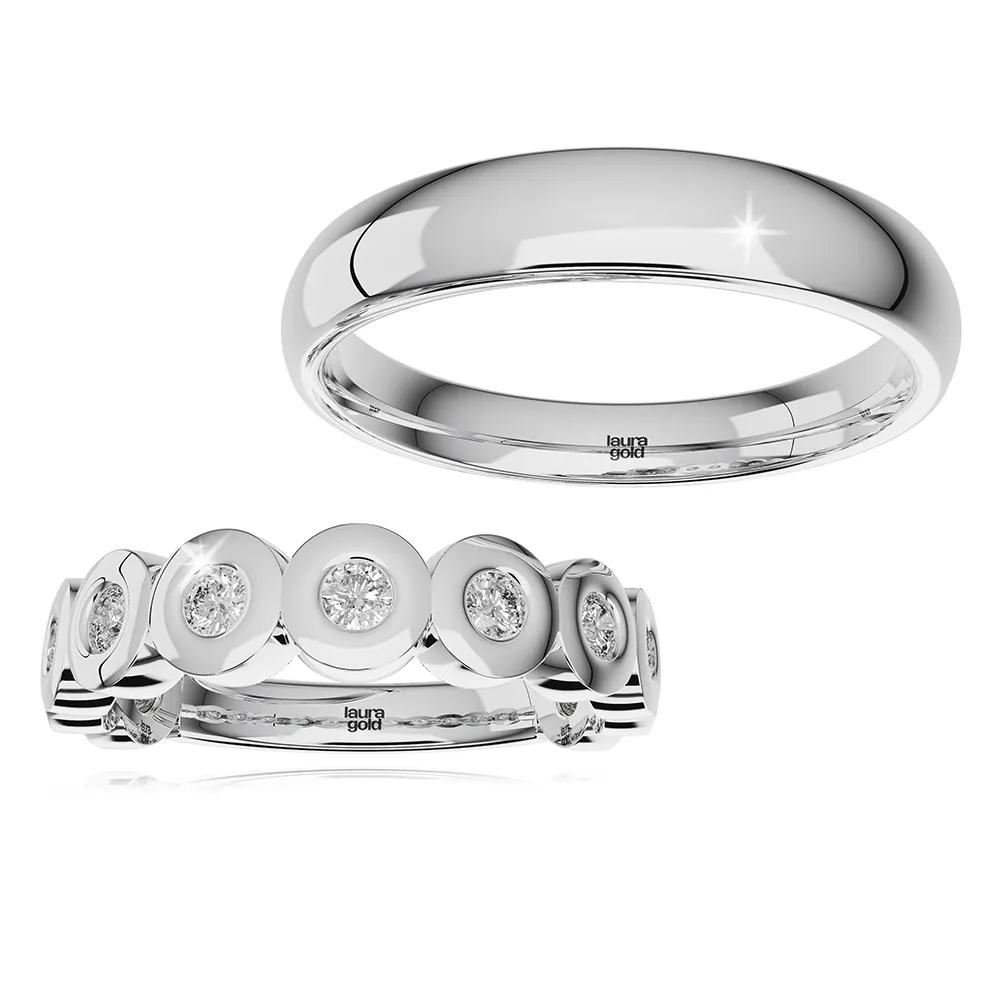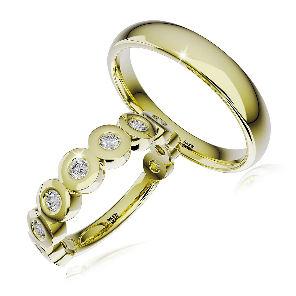 Krásne dizajnovo prevedené obrúčky. Dámska obrúčka je osadená jedenástimi kameňmi zirkónu, ktoré Vám na vaše želanie vymeníme za certifikované brilianty.