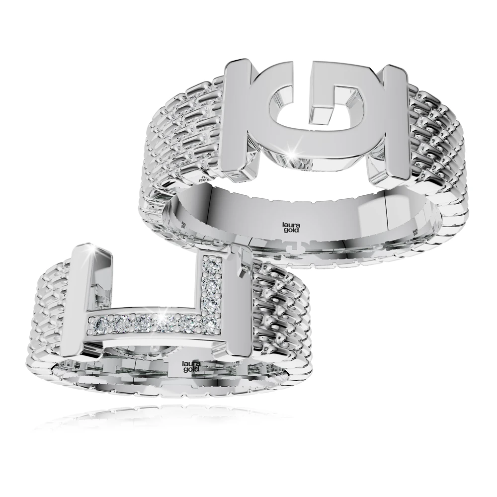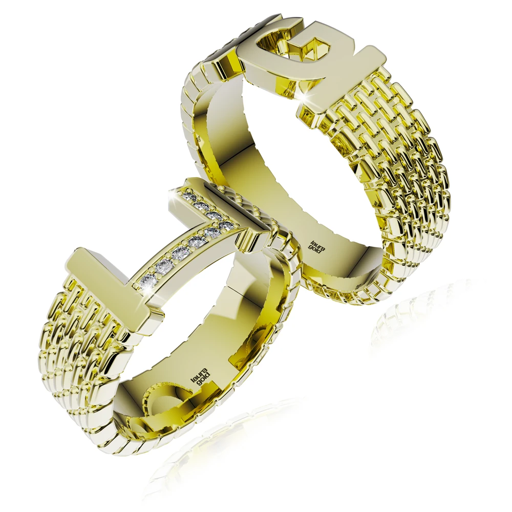 Tieto moderné obrúčky zaujmú svojím originálnym dizajnom a dokonalým prepojením štýlu a symboliky. Dámska je ozdobená radom briliantov, ktoré žiaria na výraznom geometrickom motíve, zatiaľ čo pánska pôsobí odvážne a charakterne. Spolu vytvárajú harmonický pár, ktorý vyjadruje jedinečnosť a silu vzájomného puta.