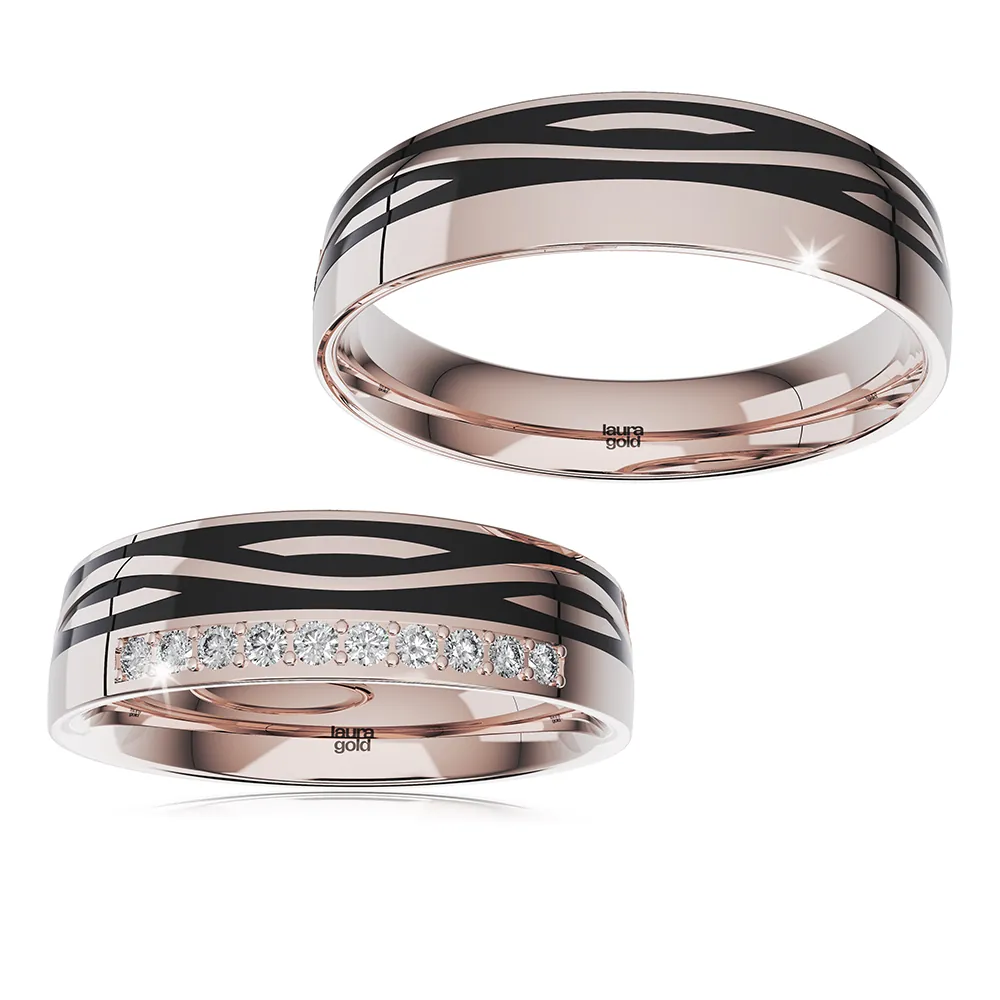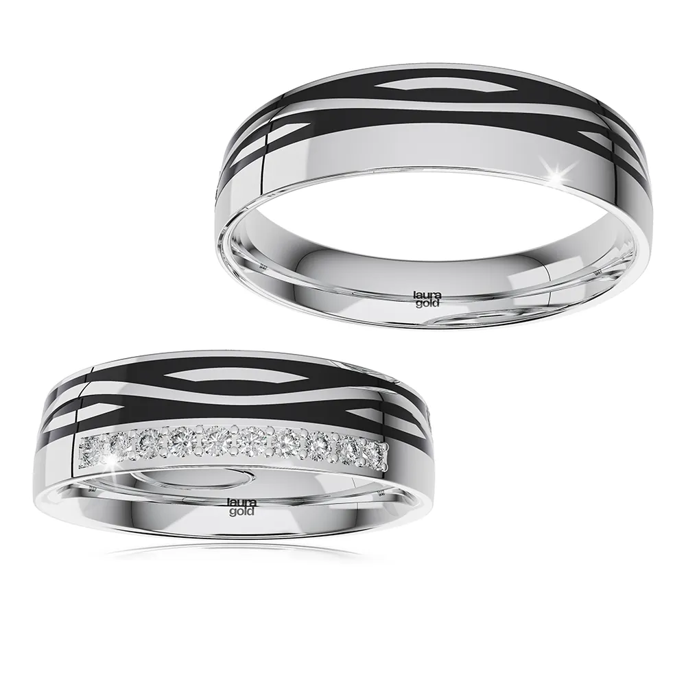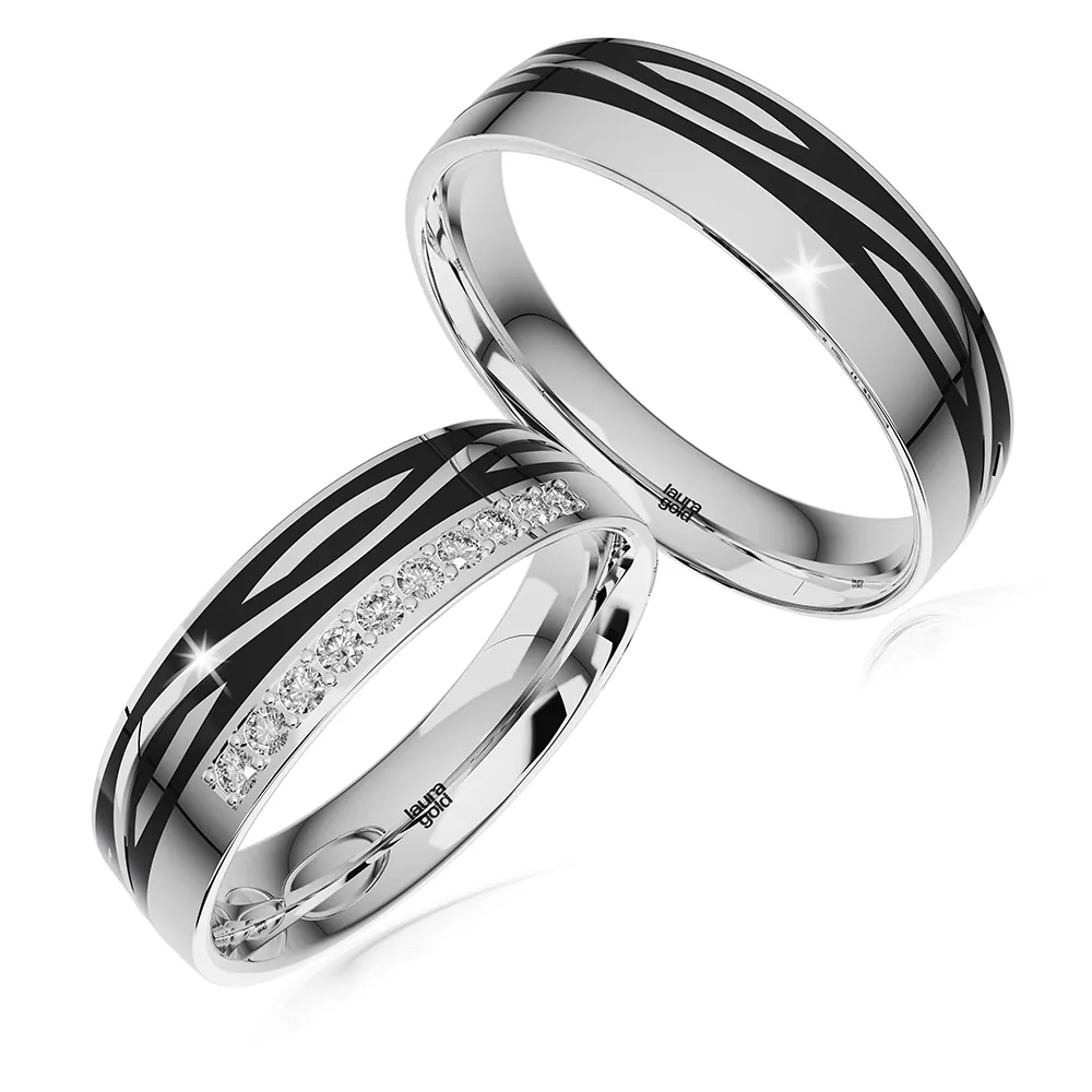 Krásne obrúčky z kolekcie Ceramik . Obe obrúčky zdobené ryhami po celom obvode vyplnené čiernym keramikom. Do dámskej obrúčky sme osadili v rovnej línii trblietavé kamene . Môžete zvoliť kamene zirkóny , alebo pravé brilianty.