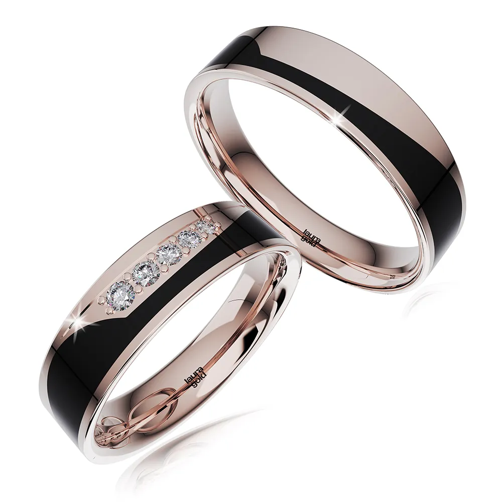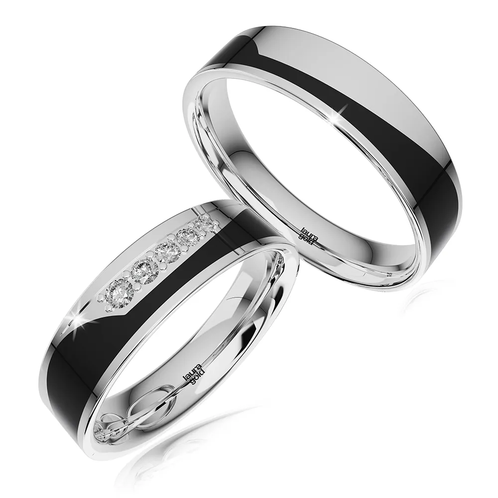 Svadobné obrúčky z rady Ceramik . Pánska v kombinácii 14 karátového bieleho zlata , zdobená čiernym keramikom. Dámska obrúčka v rovnakom dizajne s vloženými kameňmi. Môžete si zvoliť vsadenie zirkónov alebo pravých briliantov.