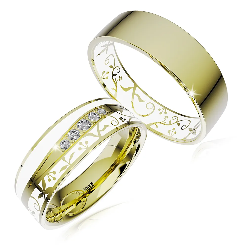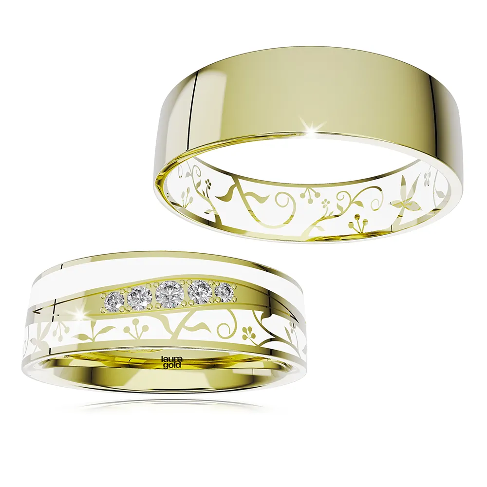 Nádherný model z rady Ceramik . Pánska obrúčka je zdobená nežnými popínavými kvietkami z vnútornej strany, z vonkajšej strany je hladká, lesklá . Dámska obrúčka je naopak vzorom zdobená z vrchnej strany , doplnená trblietavými kamienkami. Na vaše želanie vám osadíme kamienky zirkónu , alebo pravé brilianty.