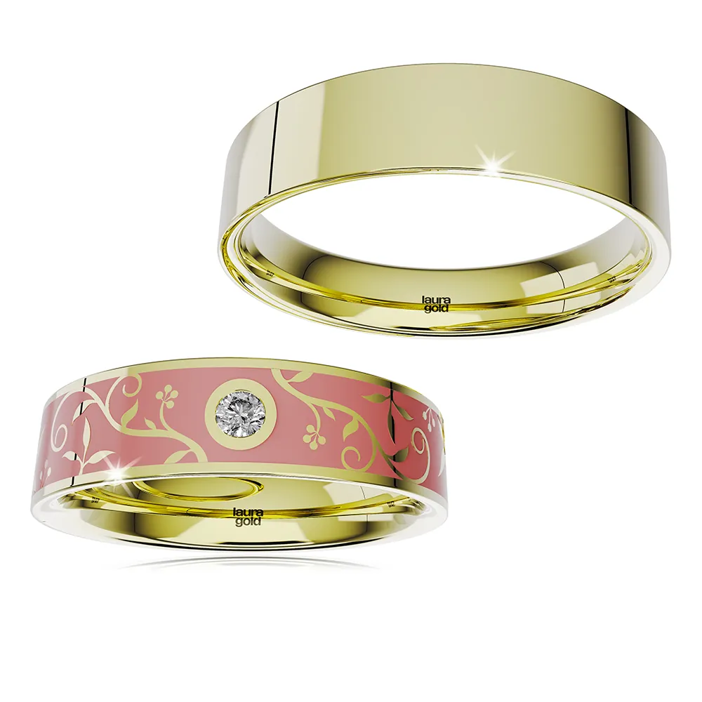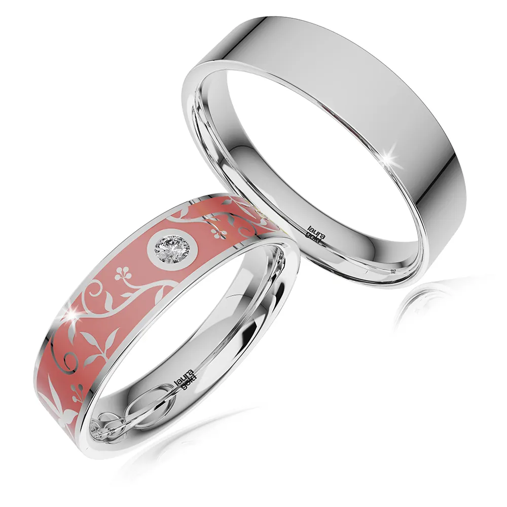 Svadobné obrúčky z kolekcie Ceramik. Kombinácia pánskej hladkej obrúčky z bieleho 14 karátového zlata s dámskou obrúčkou zdobenou jemným kvetinovým vzorom tvoreným farebnou keramikou . Naviac sme do nej osadili jeden kameň vo veľkosti 2 mm. Zvoľte si zirkón , alebo žiarivý diamant , ktorý bude pútať pozornosť.