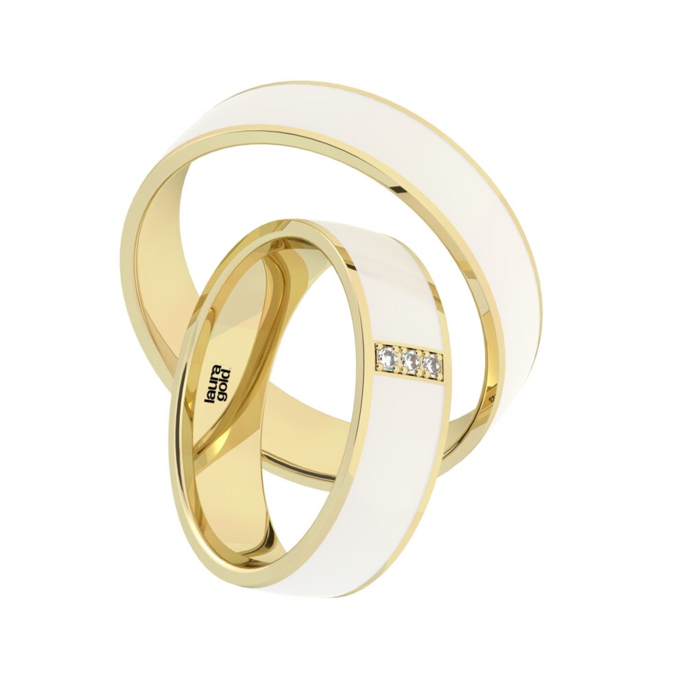 Svadobné obrúčky z rady Ceramik . Pánska obrúčka zdobená po celom obvode bielym keramikom , do dámskej obrúčky sme naviac vložili do centrálnej časti 3 kamene , ktoré príjemne prežiaria celú obrúčku. Zvolte si osadenie zirkónov , alebo certifikovaných briliantov.