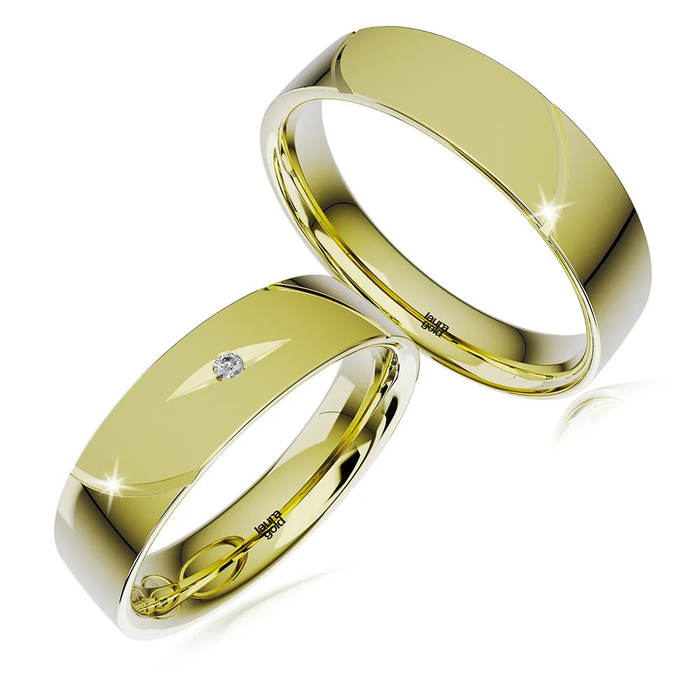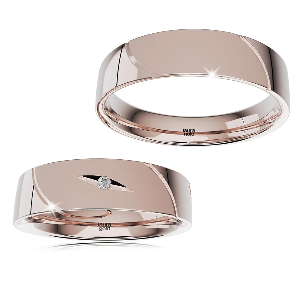 Nadčasový model z kolekcie Light +2. Dizajn je vytvorený tvarovanými ryhami oddelujúcimi centrálnu časť obrúčok a použitím povrchovej úpravy pieskovania. Jemné matovanie je zvýraznené vysokým leskom na zvyšku obrúčok. Dámska obrúčka je zdobená nežným gravírom , v ktorom je osadený trblietavý kameň. Zvoľte si zirkón ,alebo pravý briliant. Obrúčky ponúkame aj v žltom a v červenom zlate.