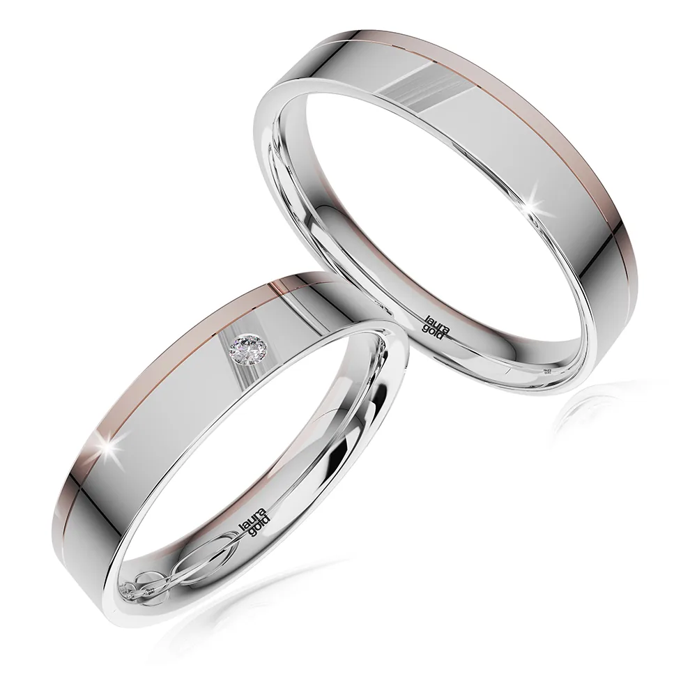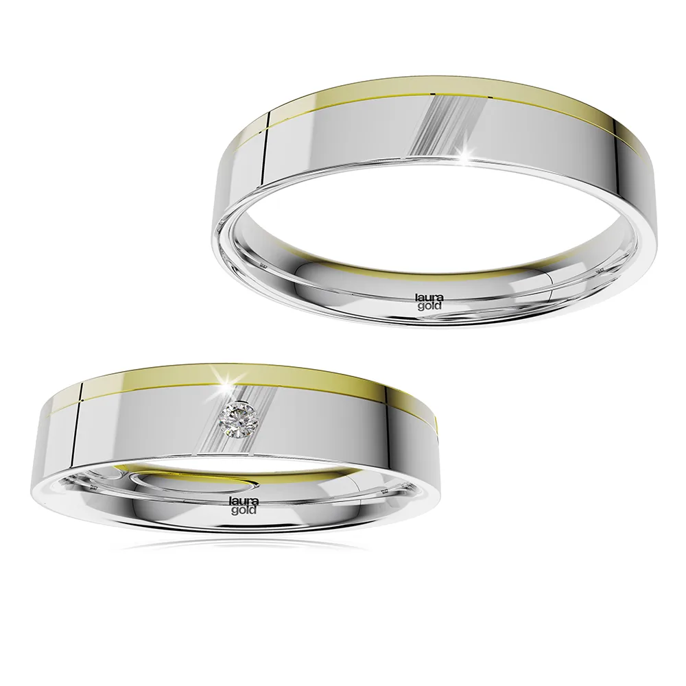 Jemné, kombinované obrúčky z kolekcie Light +2. Dominantná biela farba zlata je doplnená na jednom okraji žltým zlatom. Malý ozdobný vzor dopĺňa dizajn. Dámska obrúčka ma do vzoru vsadený trblietavý zirkón , alebo prvotriedny briliant. Farebnú kombináciu môžete zmeniť.