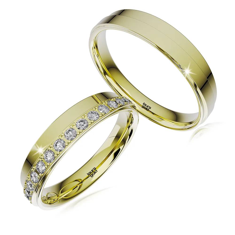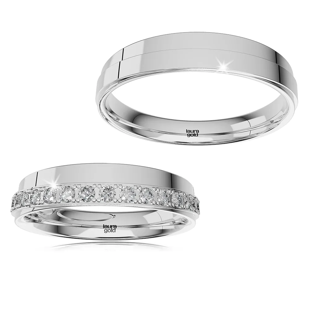 Krásne obrúčky z kolekcie Light +2. Zaujímavo vytvorený dizajn tvoriaci akoby dve vrstvy znásobuje vysoko leštený povrch. Do dámskej sme do vytvorenej vystúpenej vrstvy osadili líniu trblietavých kameňov. Zvoľte si zirkóny, alebo luxusné brilianty. Oslávte svoj Veľký deň s obrúčkami od Laura Gold.