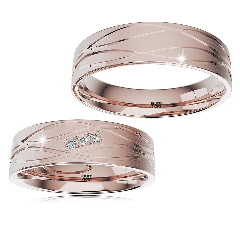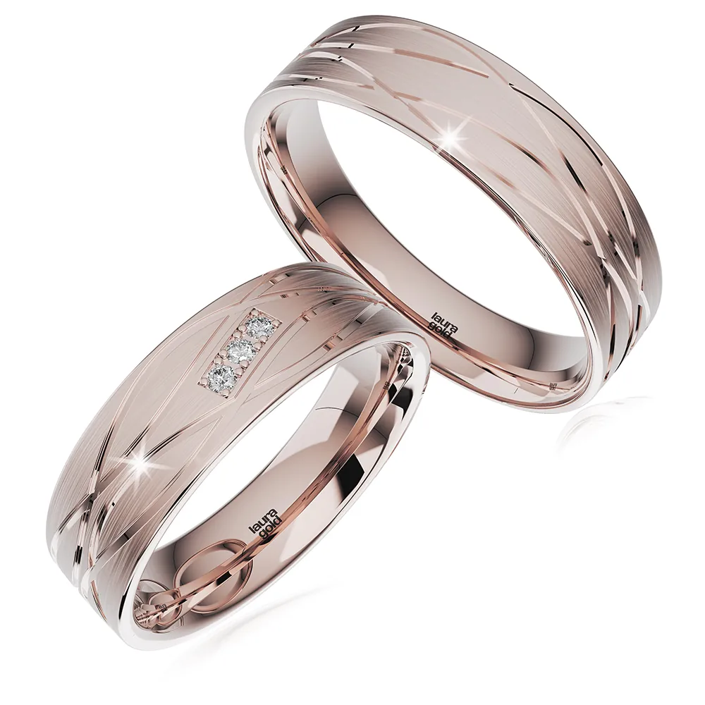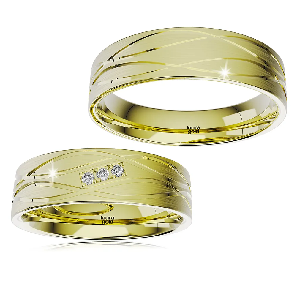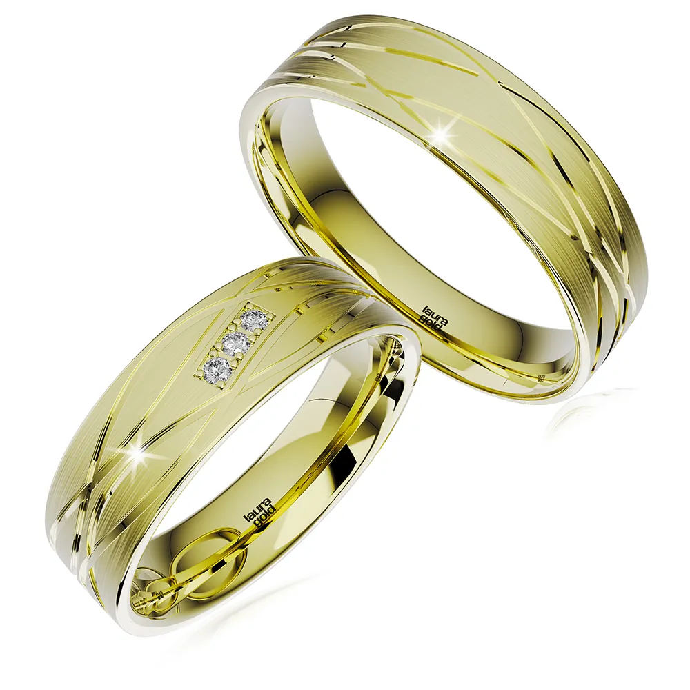 Krásny model z kolekcie Light +. Obrúčky vyrobené v žltom 14 karátovom zlate s jemným matovaním a lesklými gravírovanými líniami po celom obvode. Dámsku obrúčku sme naviac ozdobili do obdĺžnika vsadenými tromi zirkónmi alebo pravými briliantami. Na Vaše želanie ich vyrobíme pre Vás tiež zo žltého a červeného zlata.