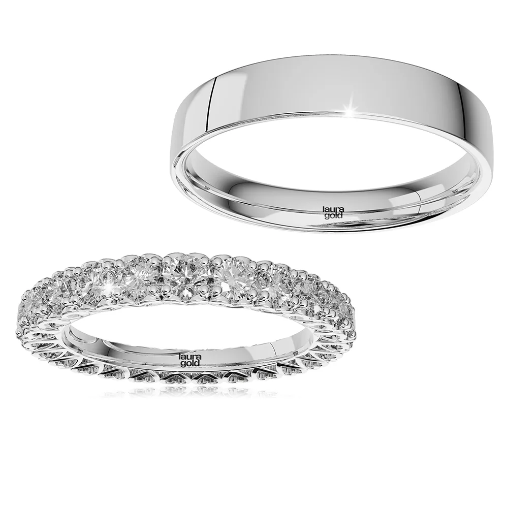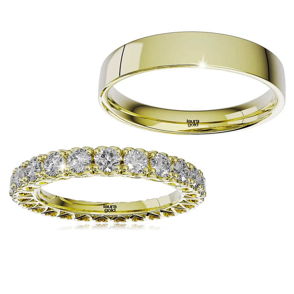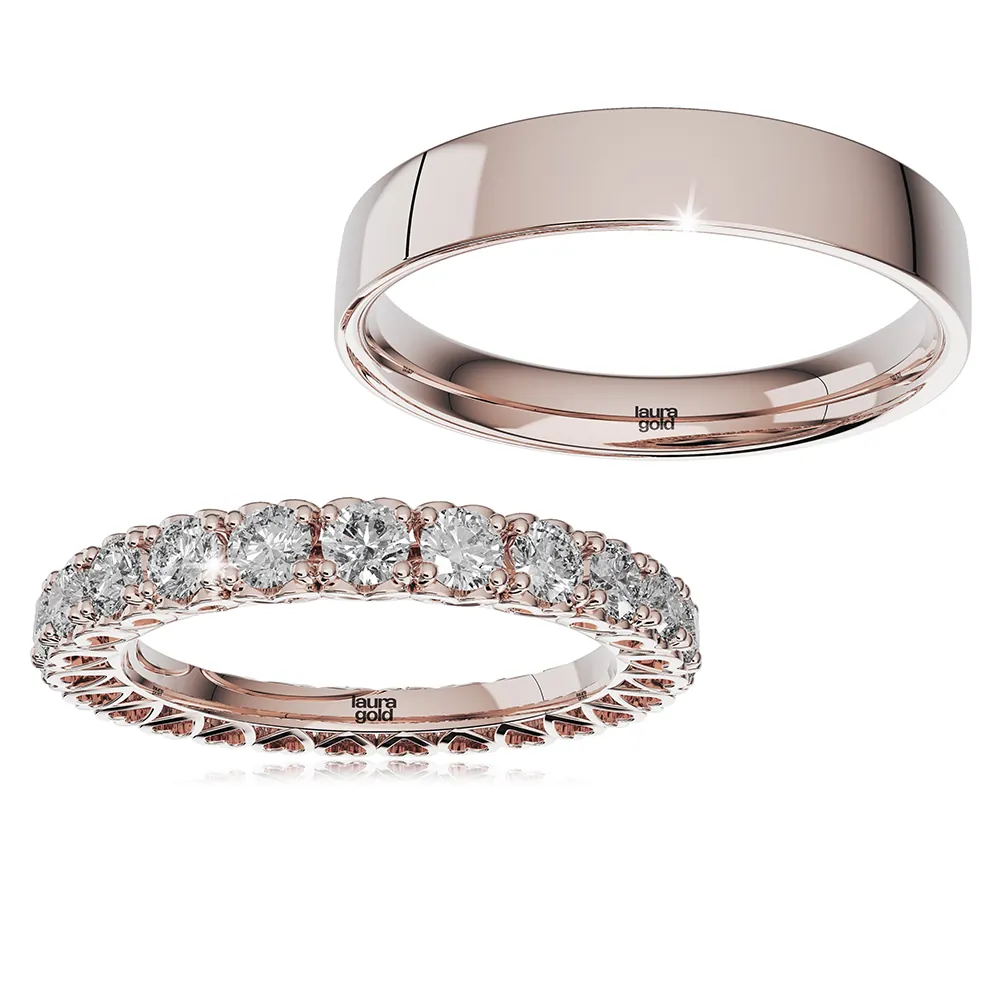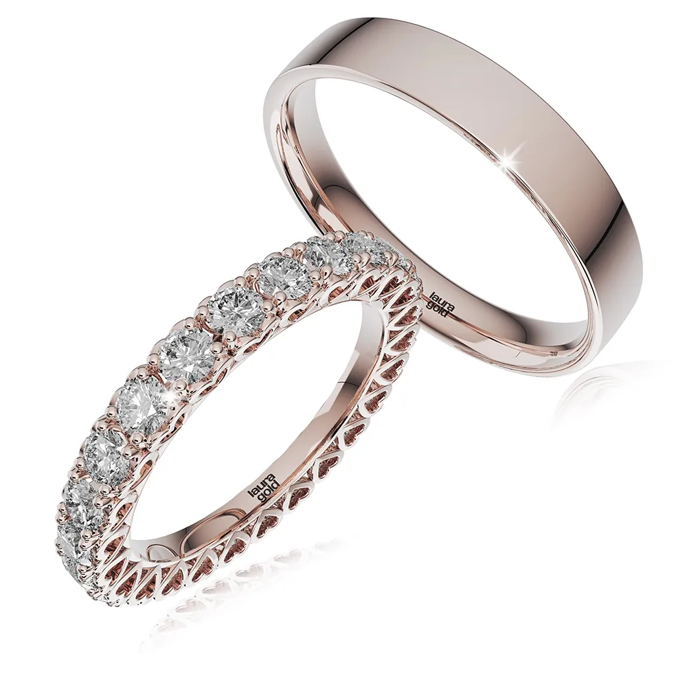 Tieto obrúčky z ružového zlata spájajú jemnosť a pôvab s noblesou a večným leskom. Kým jednoduchý hladký prsteň vyžaruje čistotu a pokoj, rad trblietavých diamantov na dámskej obrúčke rozpráva príbeh o nekonečnej láske a vášnivom spojení dvoch sŕdc. Obrúčky je možné vyrobiť aj z bieleho, žltého alebo ružového zlata, podľa želania snúbencov.