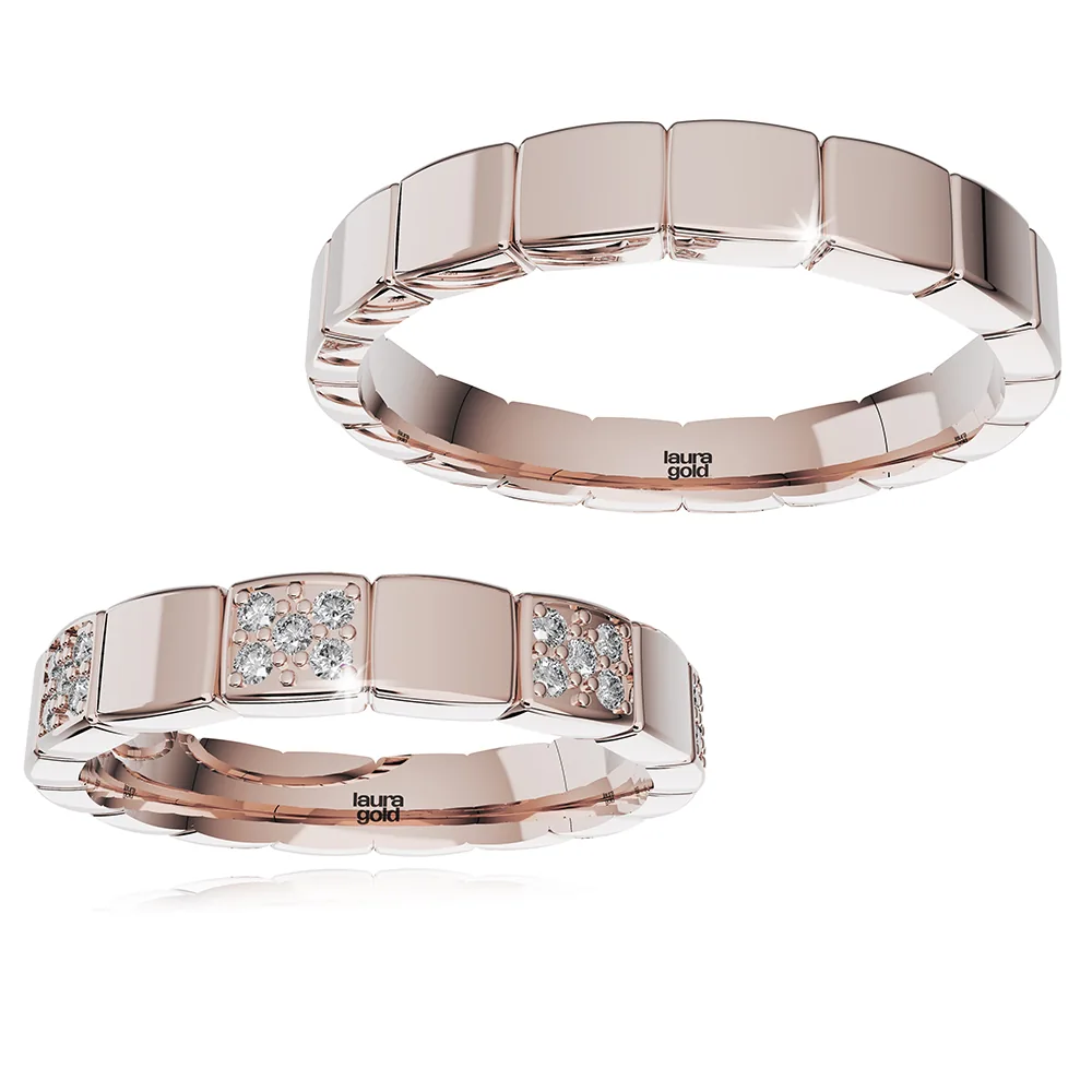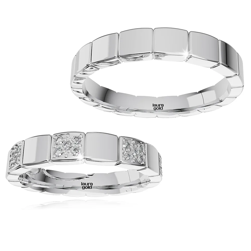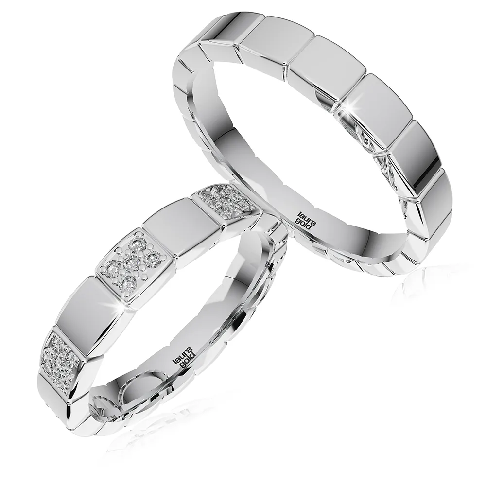 Tieto elegantné obrúčky z kolekcie LINEA spájajú moderný dizajn s nežným šarmom, pričom každý článok symbolizuje pevné puto lásky. Jemné osadenie kamienkov dodáva prsteňom luxusný lesk a jedinečný charakter. Obrúčky je možné vyrobiť z bieleho, žltého aj ružového zlata, aby dokonale vystihli štýl a osobnosť páru.