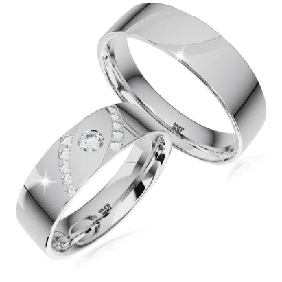 Krásny model z kolekcie Silver. Klasická, hladká pánska obrúčka s vysoko lešteným povrchom je doplnená rovnako lesklou dámskou obrúčkou, ktorá je zdobená osadenými kameňmi v centrálnej časti. Zvoľte si zirkóny, alebo luxusnejšie, nádherné brilianty. Nadčasový, ale dizajnový model zo striebra.