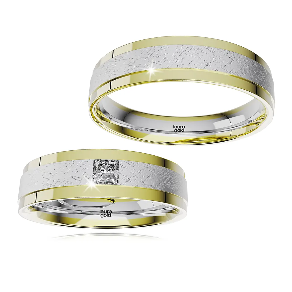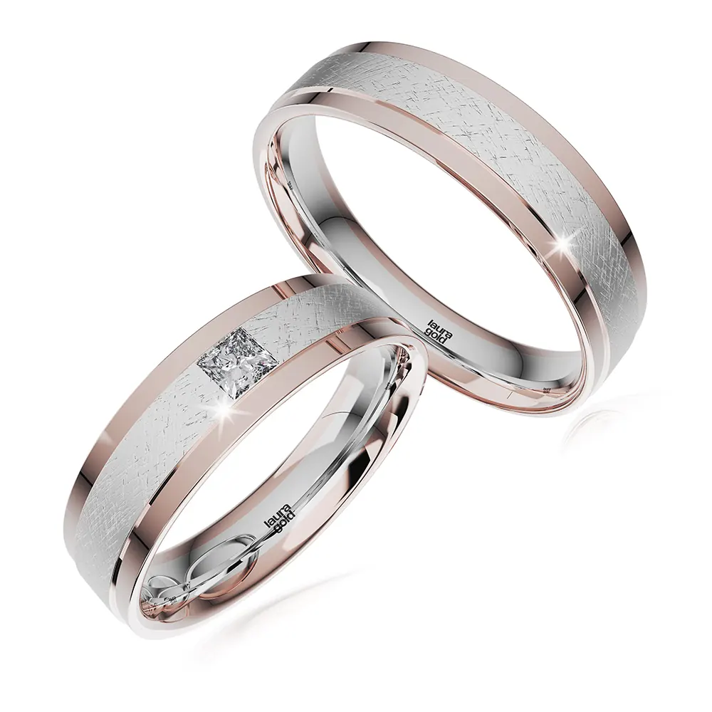 Kombinovaný model z kolekcie Colour. Nežná súhra bieleho a červeného zlata, s matovaným povrchom a so žiarivým leskom po okraji. Pre dámu sme obrúčku ozdobili nádherným zirkónom alebo briliantom s úžasným výbrusom. Prežite svoj veľký deň s našimi obrúčkami Laura Gold.
