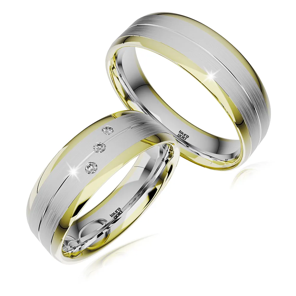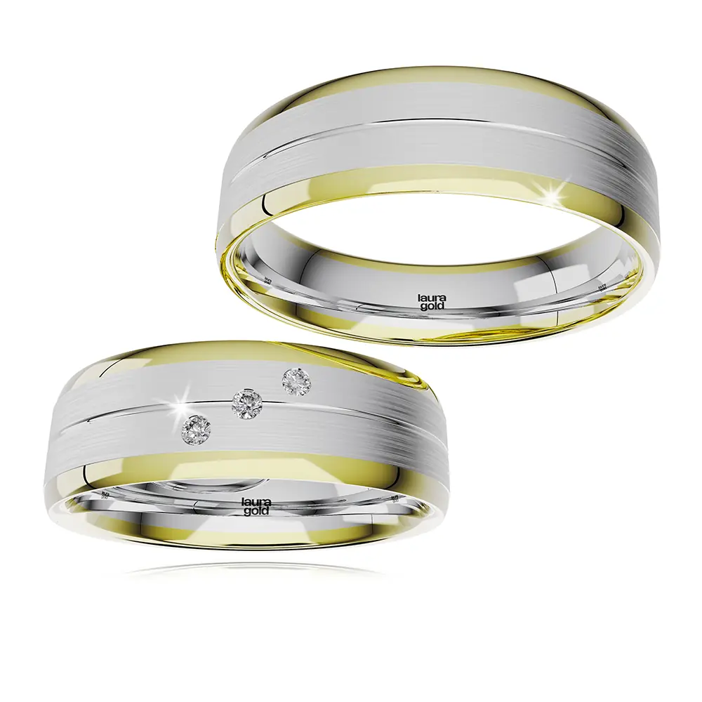 Krásne a elegantné obrúčky z kolekcie Colour. Kombinácia bieleho a žltého zlata sa v týchto prsteňoch krásne dopĺňajú spolu s leskom a matovaným povrchom. Pánska obrúčka jednoduchá , do dámskej sme naviac osadili zirkóny , alebo ak túžite po väčšom luxuse doprajte si pravé brilianty. Obrúčky Vám vyrobíme aj v inej farebnej kombinácii.