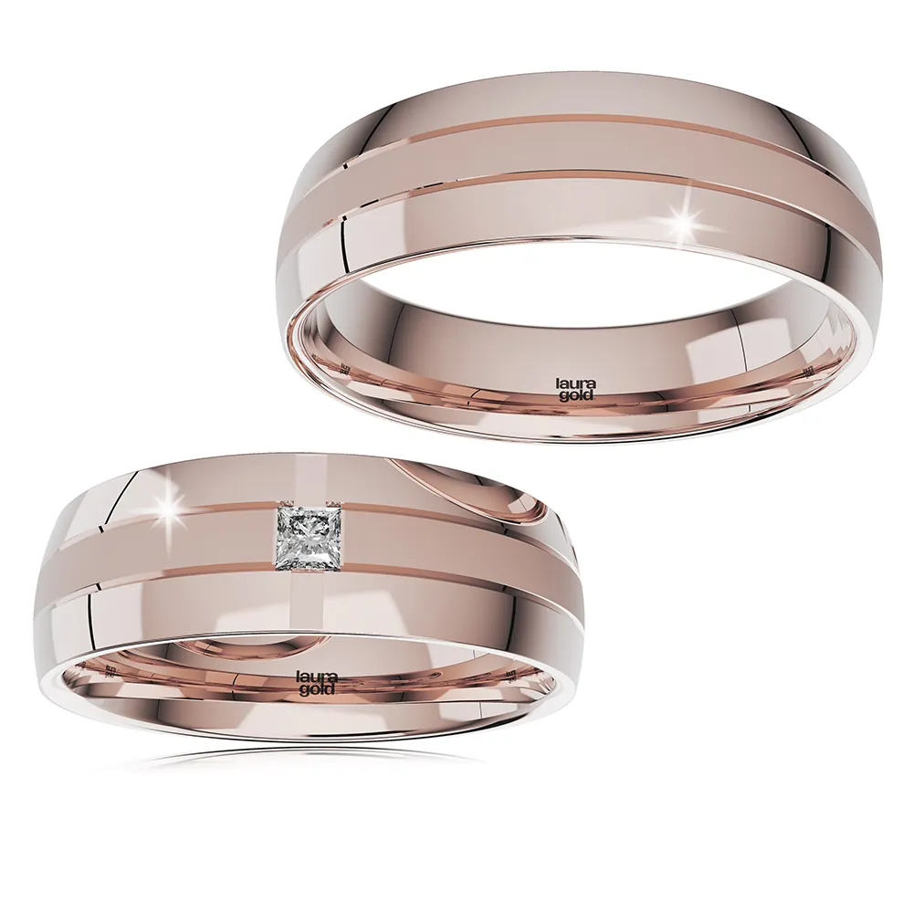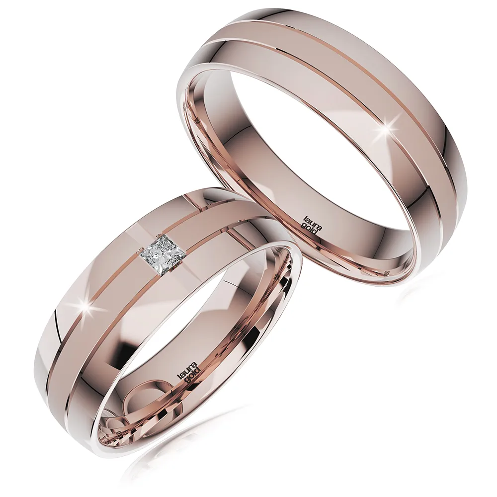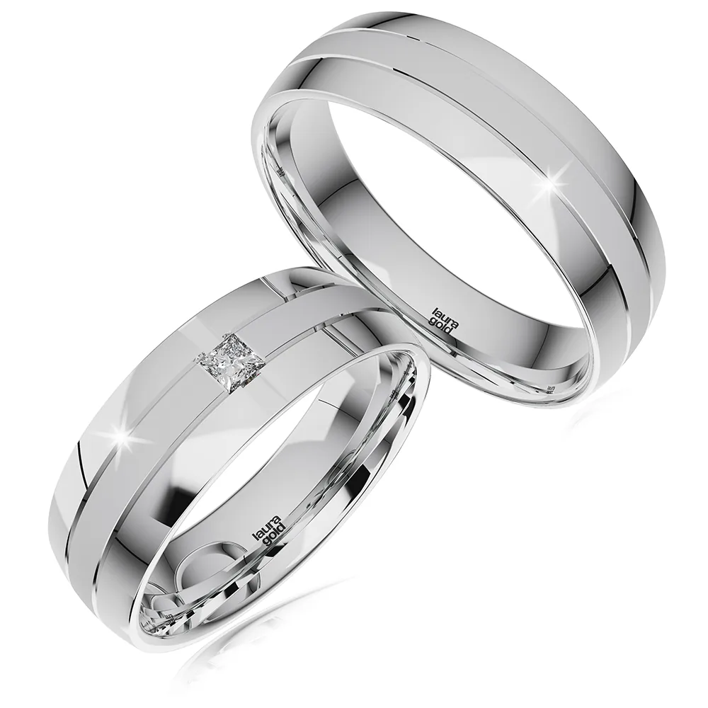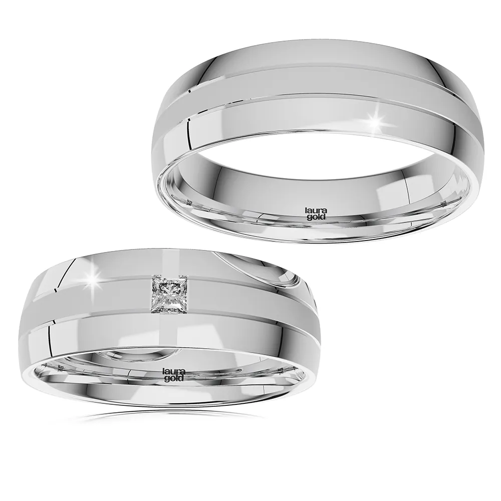 Nadčasový model z kolekcie White. Masívne, až 6 mm široké obrúčky z bieleho 14 kartového zlata. Zdobené len vysokým leskom striedajúcim sa s jemne matovaným pruhom uprostred. Do dámskeho prsteňa sme centrálne osadili 2×2 mm veľký trblietavý zirkón v tvare štvorca. Ak túžite po väčšom luxuse radi zameníme za pravý briliant. Obrúčky ponúkame aj v žltom a v červenom zlate.