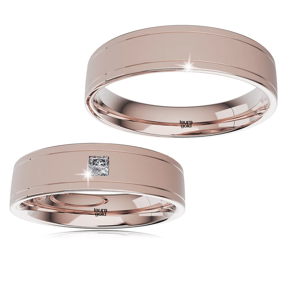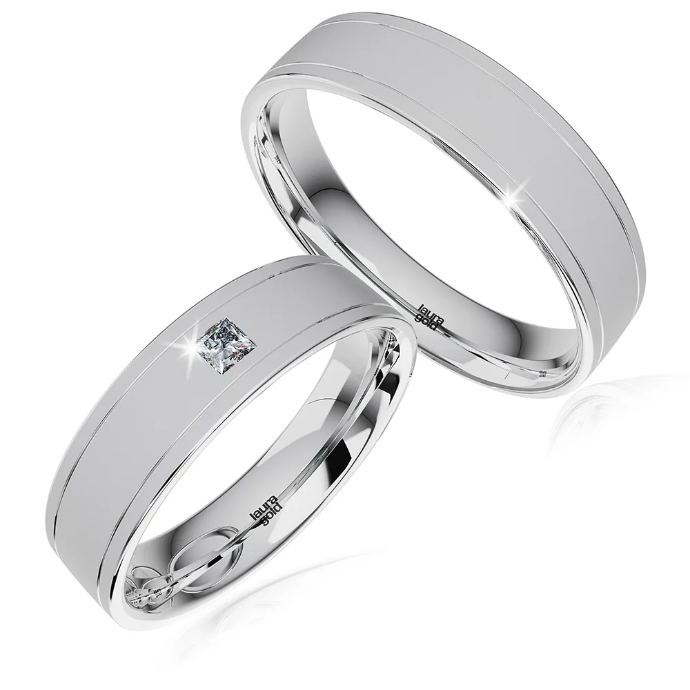 Obrúčky z kolekcie White. Očaria svojou jednoduchosťou a zároveň eleganciou. Jemné čisté línie sú zmatnené pre dlhú výdrž pri ich častom nosení. Pre dámu sme do obrúčky ručne osadili 2×2 mm veľký trblietavý zirkón, alebo pravý briliant. Obrúčky Vám vyrobíme aj v žltej a v červenej farbe.