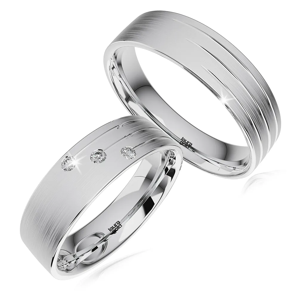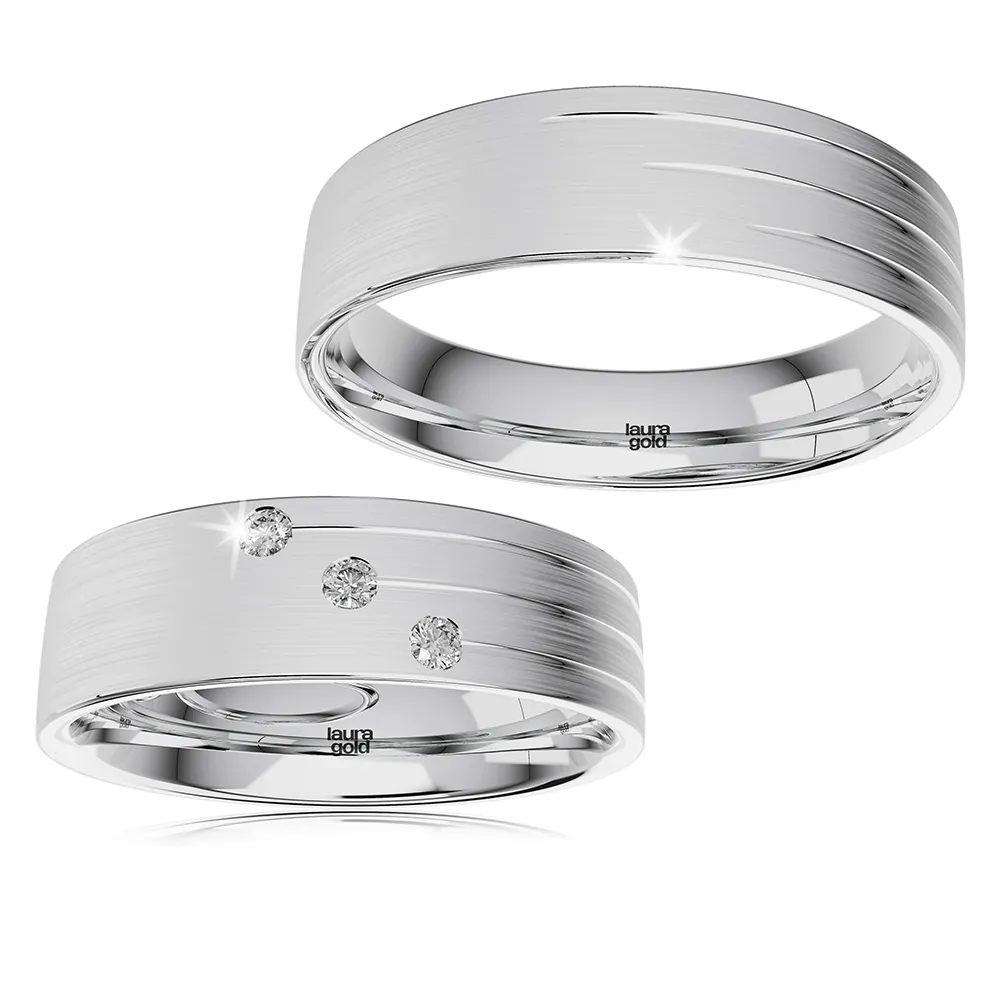 Krásny model z kolekcie White. Obrúčky z bieleho 14 karátového zlata, zdobené jemnými ryhami, jemné a elegantné zároveň. Dámsku obrúčku sme naviac doladili osadenými kameňmi zirkónu. Pre vyšší luxus Vám radi osadíme do dámskej obrúčky pravé brilianty, pre ten najatraktívnejší trblietavý efekt.