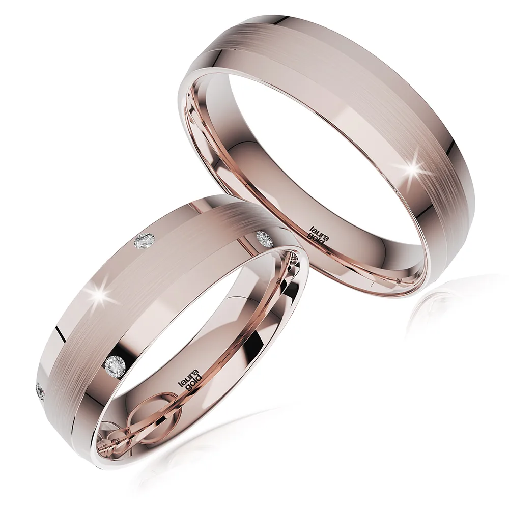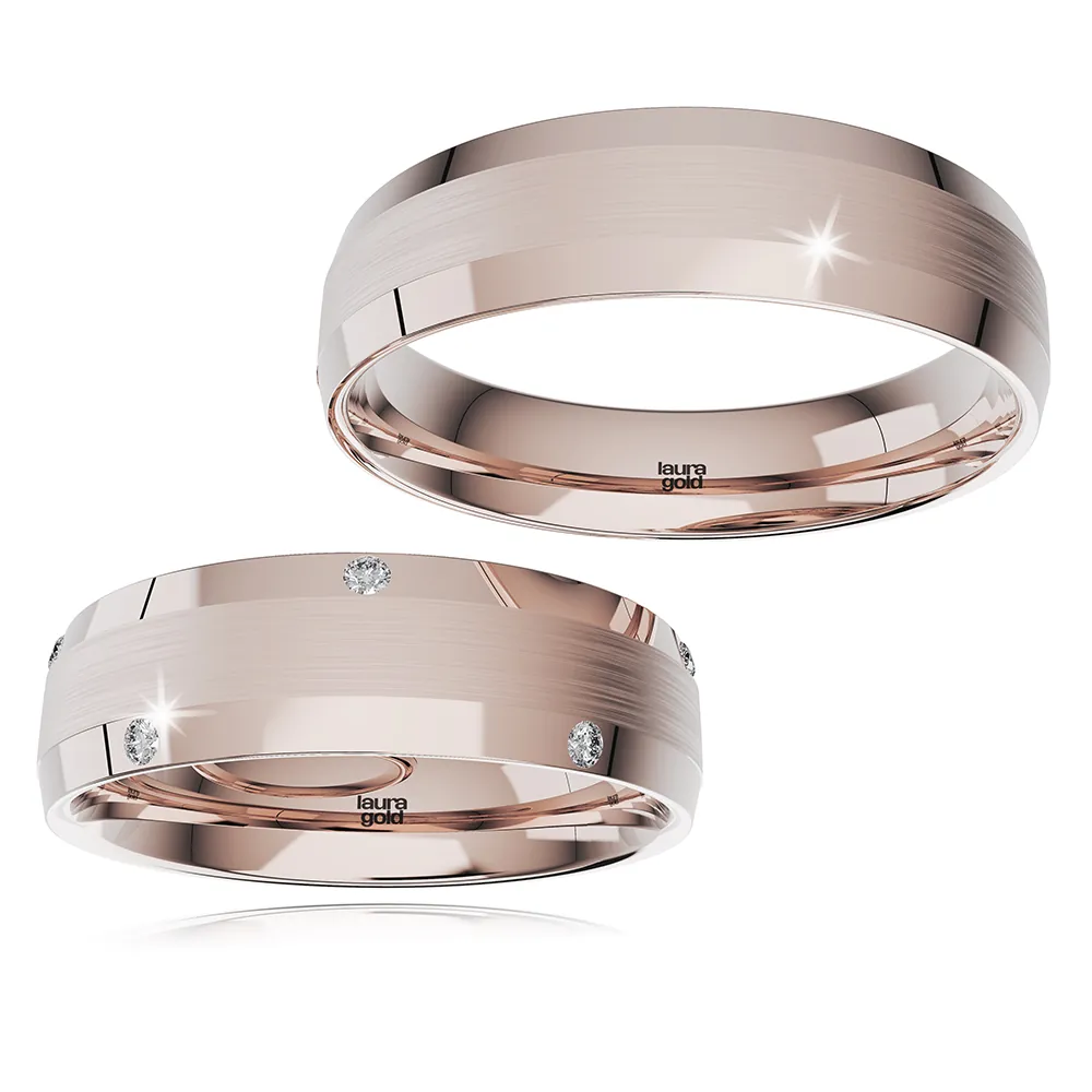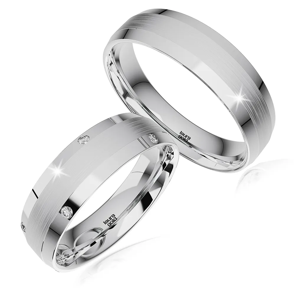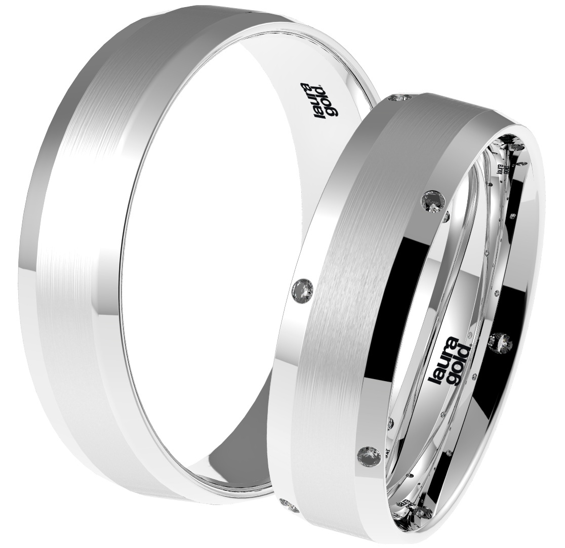 Svadobný model z kolekcie White. Jednoduchý dizajn obrúčok s mierne zrezanými hranami je elegantným a nadčasovým doplnkom . Ich povrch je jemne matovaný, doplnený lesklými okrajmi . Dámska obrúčka je zdobená 10 kusmi kameňov zirkónu , alebo nádherne brúsených diamantov. Jemný a krásny model od Laura Gold.