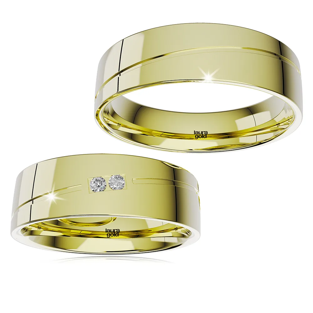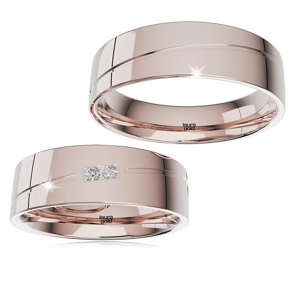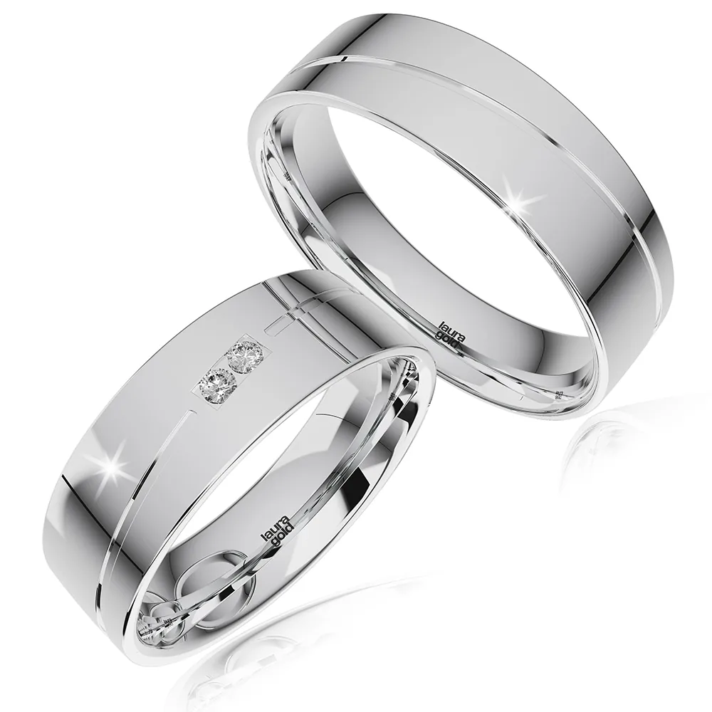 Klasický model z kolekcie White. Obrúčky z bieleho zlata v šírke 6 mm sú neprehliadnuteľným doplnkom. Pánsky model zdobený len jemnou ryhou , do dámskeho sme do ryhy osadili dva kamene zirkónu , alebo na Vaše želanie nádherne brúsené diamanty. Zvoľte si farbu zlata podľa svojho želania.