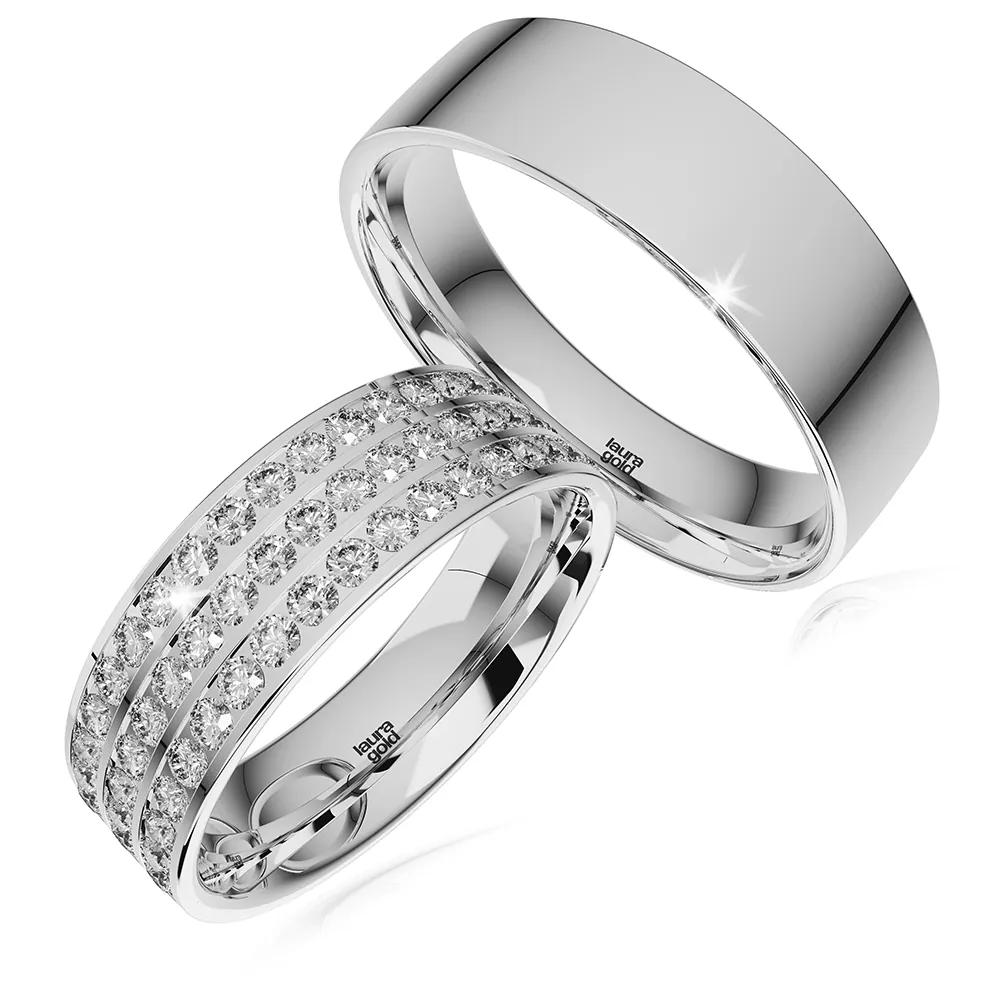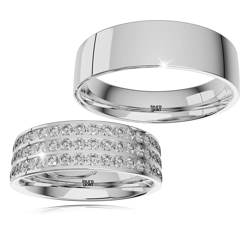 Obľúbený model z kolekcie White. Pánska obrúčka v klasickom hladkom prevedení s vysokým leskom je doplnená nádherne prepracovaným dámskym prsteňom, ktorý je ozdobený troma radami kameňov. Čierne kamene sa vynímajú v spoločnosti bielych žiarivých zirkónov, alebo ak túžite po luxuse pravých briliantov. Elegancia a romantika z Laura Gold.