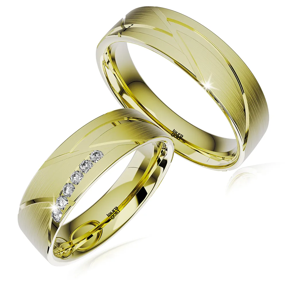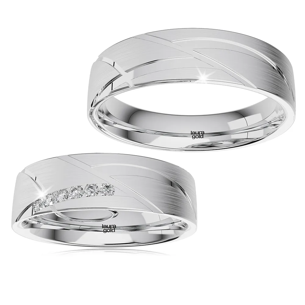 Nadčasový model z kolekcie White . Obrúčky z bieleho 14 karátového zlata, zdobené gravírovanými líniami . Do dámskej obrúčky je vsadených sedem kameňov. Zvoľte si zirkóny, alebo pravé diamanty brúsené do nádhernej podoby. Krása a luxus od Laura Gold.