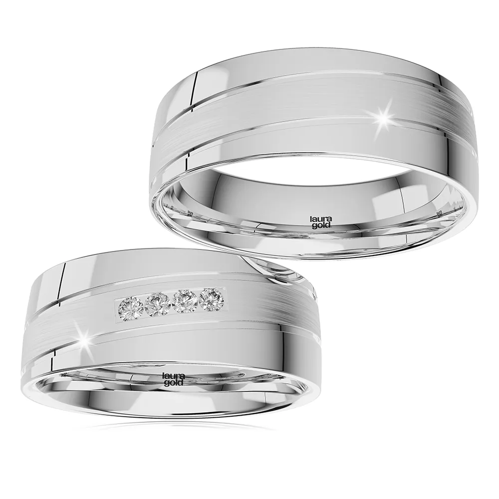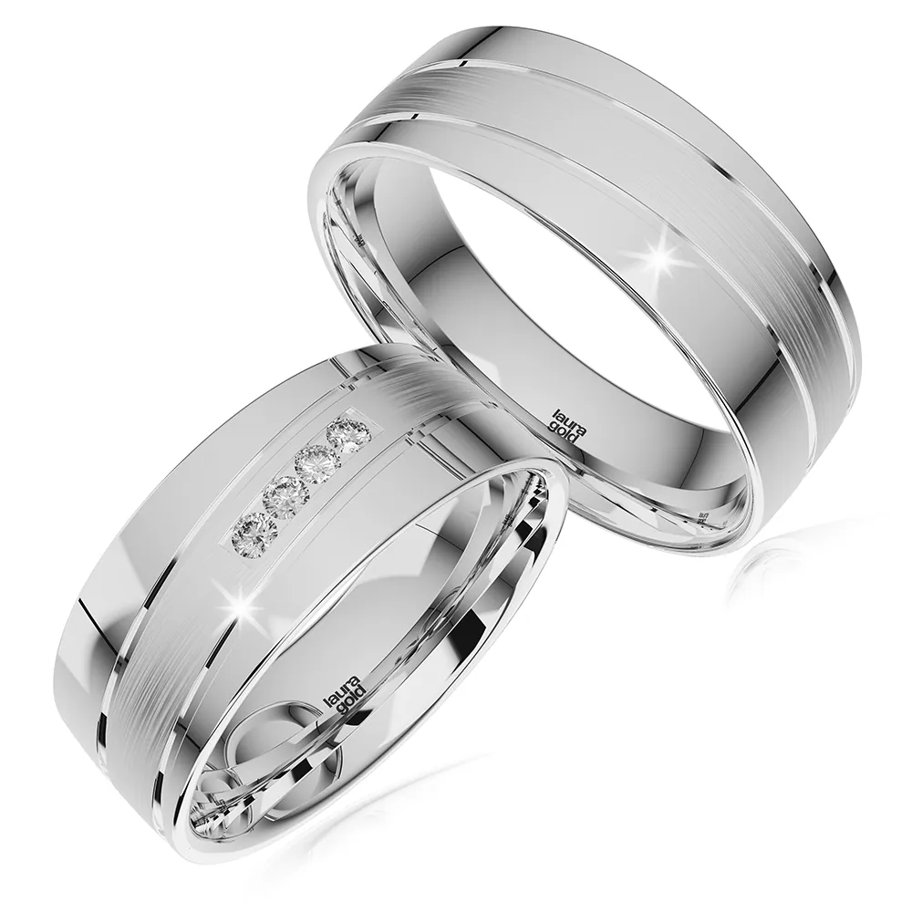 Nadčasový model z kolekcie White . Luxusné 7 mm široké obrúčky s vysokým leskom sú zdobené vinúcou sa líniou s pozdĺžnym matom . Do dámskej obrúčky sme naviac osadili štyri kamene zirkóny, alebo na Vaše želanie pravé diamanty brúsené do nádhernej podoby. Tieto obrúčky sú neprehliadnuteľné.