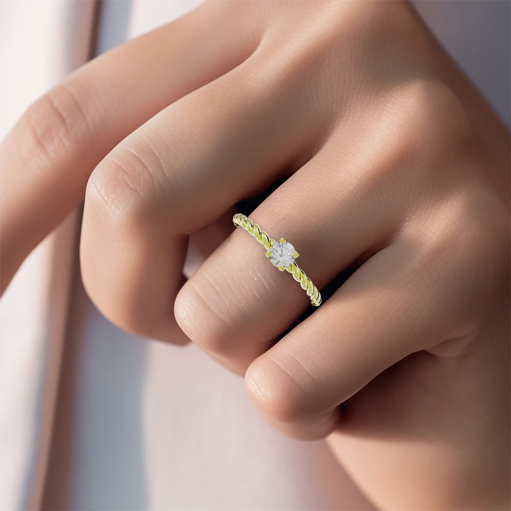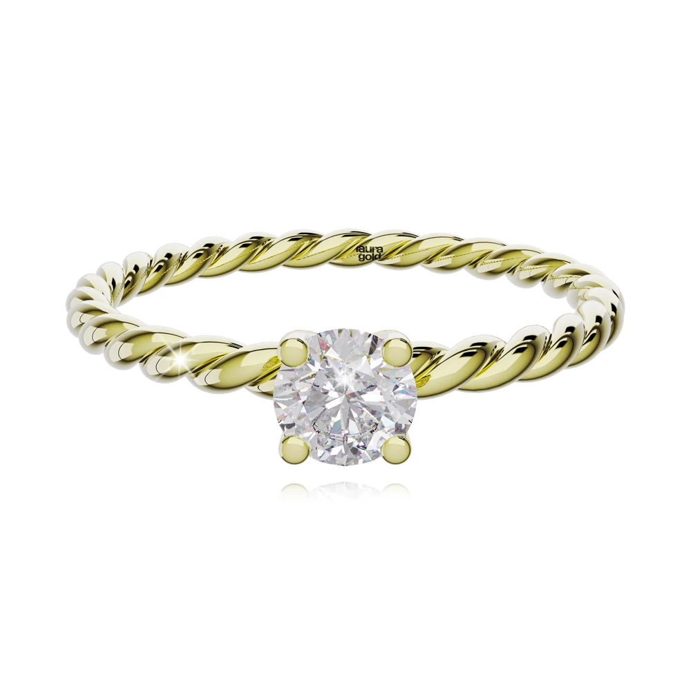 Tento zásnubný prsteň zo žltého zlata ponúka jemný točený dizajn, ktorý odkazuje na nekonečnú lásku. Žiarivý stredový kameň dokonale kontrastuje s teplým odtieňom zlata, čím vytvára jedinečný šperk, ktorý sa bude nosiť s hrdosťou po celý život.