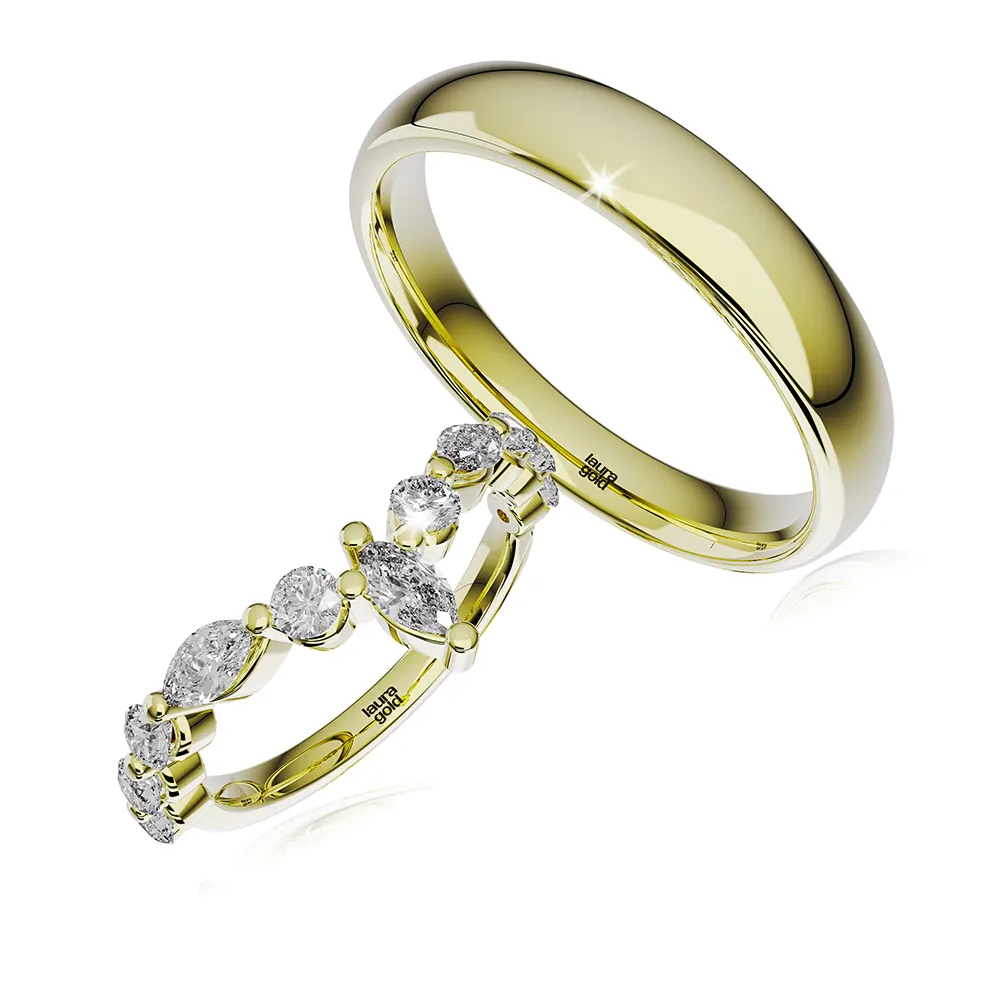 Tieto nádherné obrúčky symbolizujú nekonečnú lásku a puto dvoch sŕdc, ktoré sa rozhodli kráčať životom spolu. Ich elegantný dizajn je možné vyrobiť z bieleho, žltého a ružového 14-karátového zlata, aby dokonale odrážali jedinečný príbeh každého páru. Jemné línie a lesk zlata sú odrazom nežnosti, oddanosti a krásy spoločnej budúcnosti.