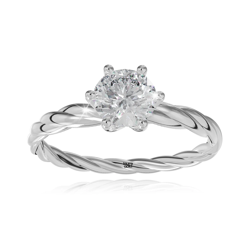 Zásnubný prsteň, elegantný a sofistikovaný. Má jemne prepletený kovový vzor symbolizujúci pevné spojenie. Na vrchu sa vyníma číry kameň uchytený v šiestich krapničkách, ktoré mu umožňujú maximálne zachytiť a odrážať svetlo. Tento prsteň je luxusný a moderný, ideálny pre výnimočný okamih zásnub.