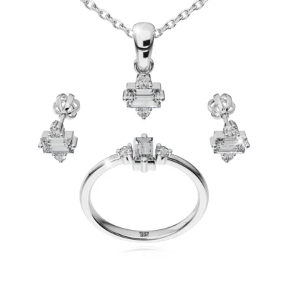 Tento očarujúci set šperkov zo žltého zlata vyniká svojou prepracovanou krásou a detailmi. Prsteň, náušnice a prívesok sú zdobené žiarivými diamantmi v tvare kvetov, ktoré symbolizujú eleganciu a nadčasovú romantiku. S iskrivým leskom a sofistikovaným dizajnom je tento set dokonalým vyjadrením lásky a výnimočnosti.