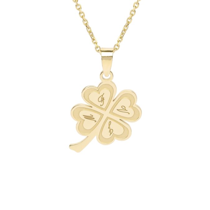 Prívesok je v tvare štvorlístka, symbolizujúceho šťastie a šťastné príležitosti. Každý lístok má vryté iniciály, ktoré tvoria osobný a výnimočný prívesok. Tieto iniciály sú umiestnené v strede každého lístka a sú elegantne vyryté do povrchu, čím sa zdôrazňuje ich krása a jedinečnosť. Vyberte si materiál alebo farbu zlata a vytvorte si šperk, ktorý vám prinesie šťastie.