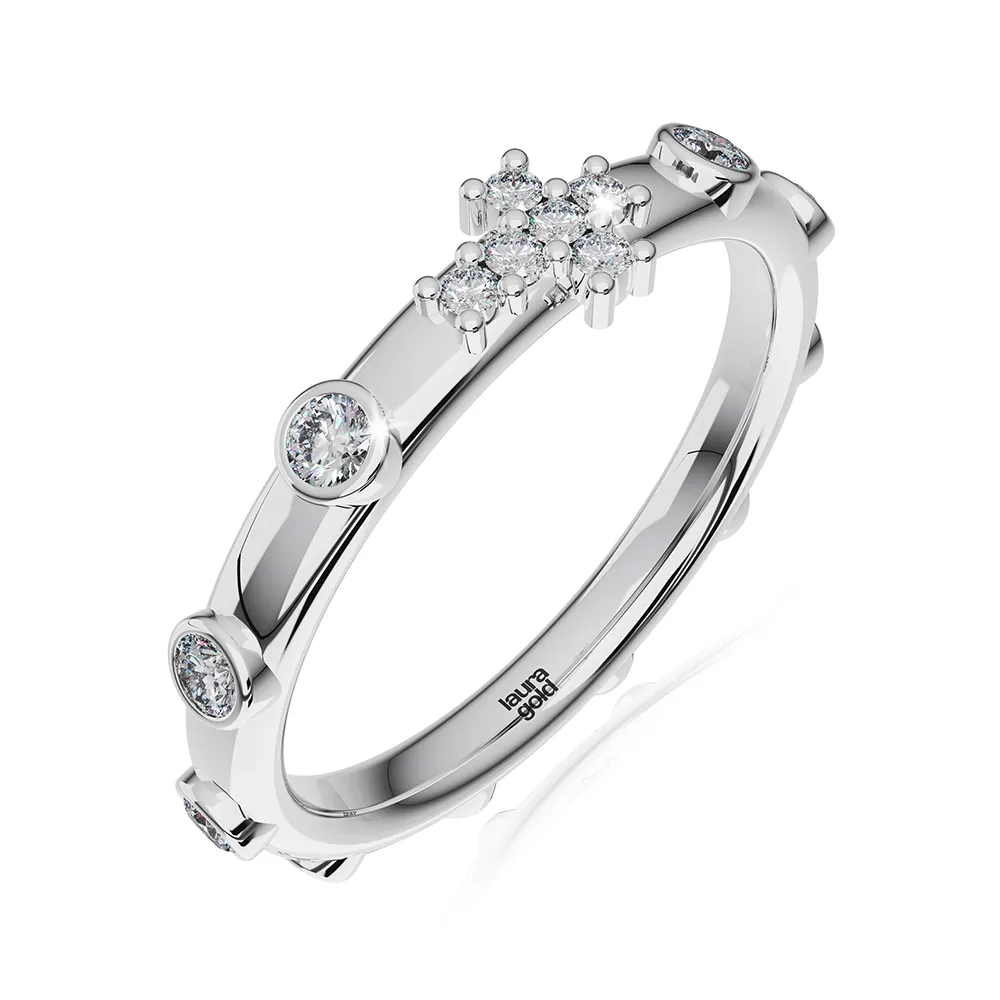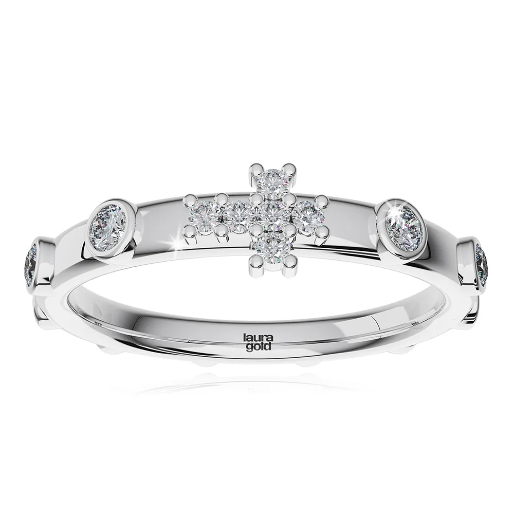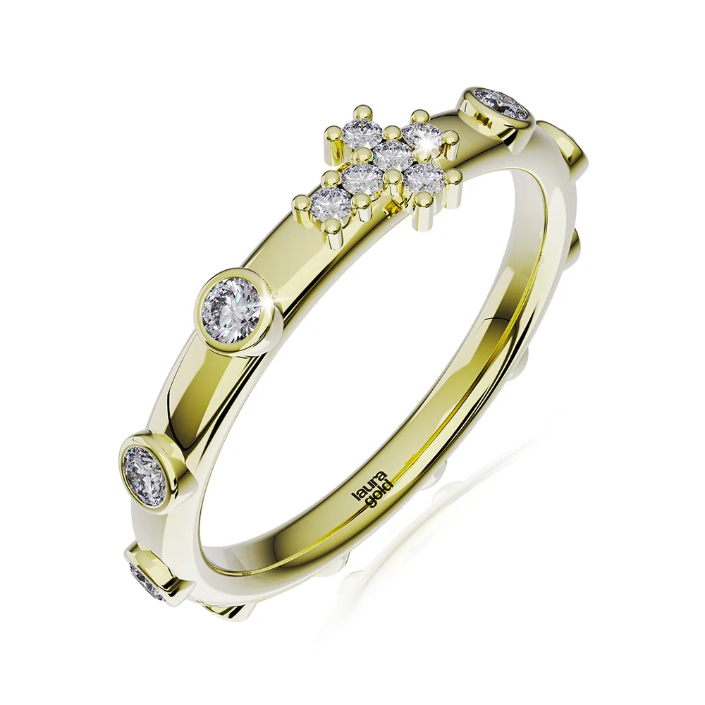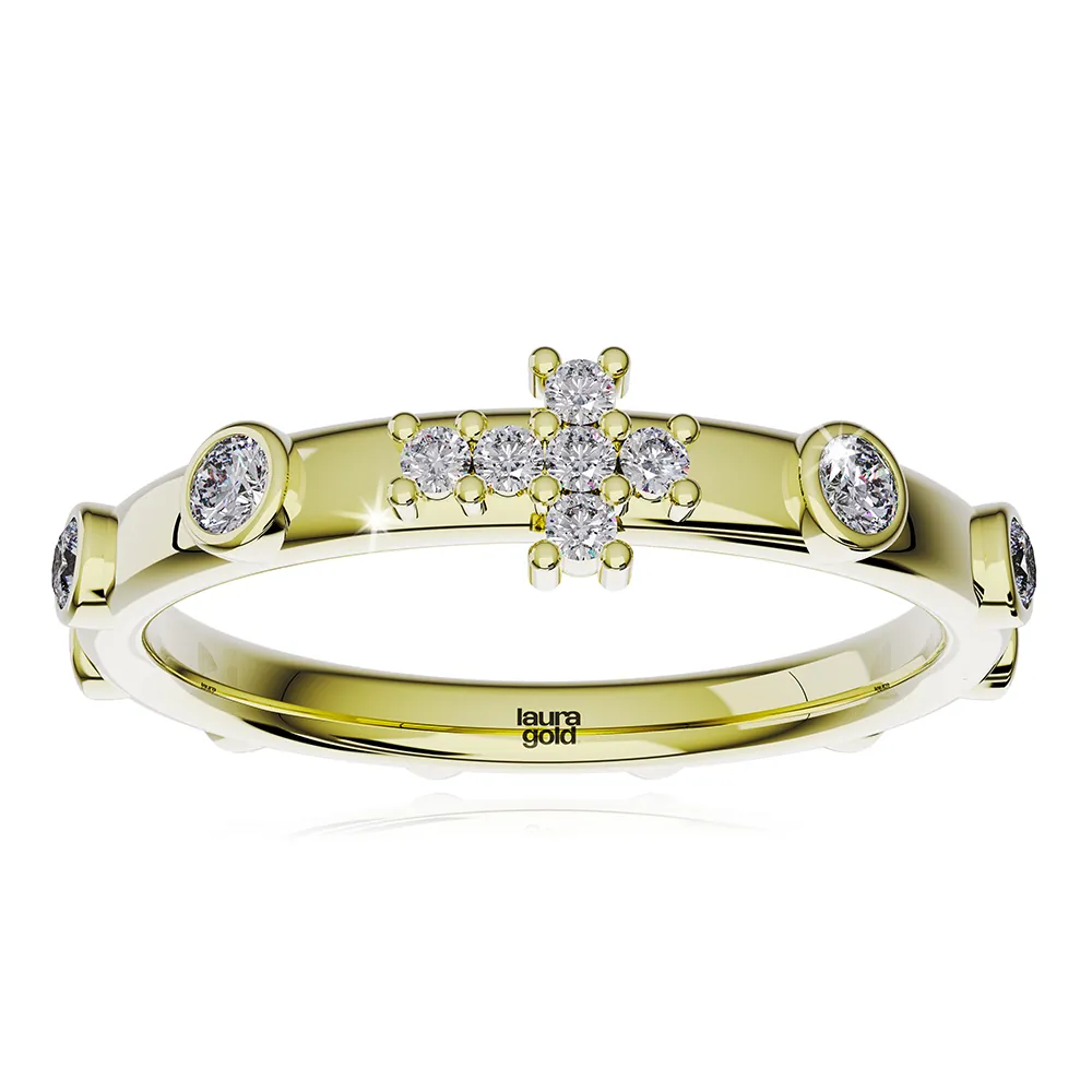 Ružencový prsteň zo žltého zlata zaujme svojou čistou symbolikou, kde jednoduchý kríž vyžaruje tichú eleganciu. Trblietavé kamienky po obvode pôsobia ako jemné modlitby, ktoré nositeľovi pripomínajú pokoj a nádej. Rovnako pôvabné budú aj prevedenia z bieleho a ružového zlata, každé s vlastným kúzlom a romantickým tónom.